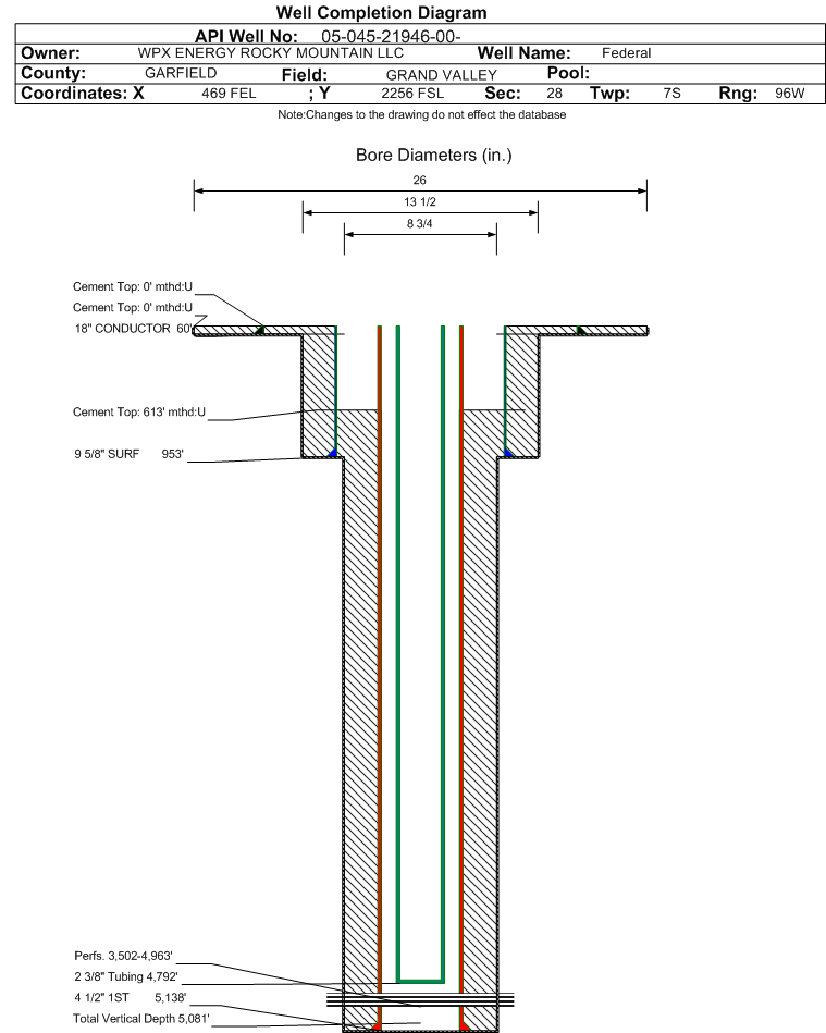 Wellbore #00 Wellbore Classification: GW Status: PR - 1/6/2015 Measured TD: 5150 ft. Vertical TD: 5081 ft.| Wellbore Data for Original Wellbore | Wellbore Classification: GW PR - 1/6/2015 | | Wellbore Permit | DIRECTIONAL | | Permit #: | | Expiration Date: | 3/28/2015 | | Proposed Top PZ Location: | Sec:28 Twp: 7S 96W | Footage: 2514 FNL 135 FEL | | Bottom Hole Location: | Sec:28 Twp: 7S 96W | Footage: 2514 FNL 135 FEL | | Proposed Depth/Form: | 5150 ft. | | Surface Mineral Owner Same: | Yes | | Mineral Owner: | FEDERAL | Surface Owner: | FEDERAL | | Unit: | | Unit Number: | | | Formation And Spacing: | Code: WMFK , Formation: WILLIAMS FORK , Order: 510-20 , Unit Acreage: , Drill Unit: | | Casing: | String Type: CONDUCTOR, Hole Size: 26 in., Size: 18 in., Top: 0 ft., Depth: 80 ft., Weight: 48# , Citings Type: PLANNED | | Cement: | Sacks: 50, Top: 0 ft., Bottom: 80 ft. | | Casing: | String Type: SURF, Hole Size: 13.5 in., Size: 9.625 in., Top: 0 ft., Depth: 905 ft., Weight: 32.3# , Citings Type: PLANNED | | Cement: | Sacks: 242, Top: 0 ft., Bottom: 905 ft. | | Casing: | String Type: 1ST, Hole Size: 8.75 in., Size: 4.5 in., Top: 0 ft., Depth: 5146 ft., Weight: 11.6# , Citings Type: PLANNED | | Cement: | Sacks: 696, Top: 2058 ft., Bottom: 5146 ft. |