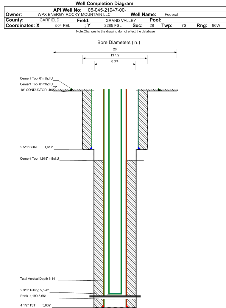 | Wellbore Completed | | Completion Date: | 10/13/2014 | | Spud Date: | 10/8/2014 | Spud Date Is: | ACTUAL | | Measured TD: | 5890 ft. | Measured PB depth: | 5840 ft. | | True Vertical TD: | 5141 ft. | True Vertical PB depth: | 5091 ft. | | Top PZ Location: | Sec:28 Twp: 7S 96W | Footage: 1878 FNL 2294 FEL | | Bottom Hole Location: | Sec:28 Twp: 7S 96W | Footage: 1840 FNL 2359 FEL | | Log Types: | RPM CBL MUDLOGS | | Casing: | String Type: CONDUCTOR, Hole Size: 26 in., Size: 18 in., Top: 0 ft., Depth: 40 ft., Weight: 48 , Citings Type: ACTUAL | | Cement: | Sacks: 15, Top: 0 ft., Bottom: 40 ft., Determination Method: VISU | | Casing: | String Type: SURF, Hole Size: 13.5 in., Size: 9.625 in., Top: 0 ft., Depth: 1617 ft., Weight: 32.3 , Citings Type: ACTUAL | | Cement: | Sacks: 405, Top: 0 ft., Bottom: 1617 ft., Determination Method: VISU | | Casing: | String Type: 1ST, Hole Size: 8.75 in., Size: 4.5 in., Top: 0 ft., Depth: 5882 ft., Weight: 11.6 , Citings Type: ACTUAL | | Cement: | Sacks: 980, Top: 1918 ft., Bottom: 5882 ft., Determination Method: CBL | | Formation | Interval Top | Log Bottom | Cored | DSTs | | WASATCH G | 767 ft. | | N | | | MESAVERDE | 2671 ft. | | N | | | CAMEO | 5294 ft. | | N | | | ROLLINS | 5748 ft. | | N | |
