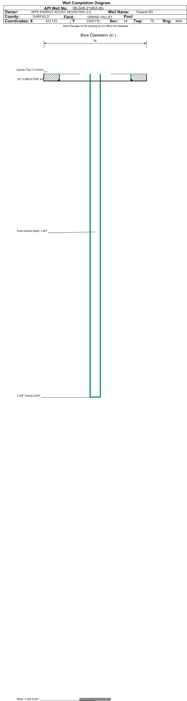 Wellbore #00 Wellbore Classification: GW Status: AB - 1/10/2015 Measured TD: 1760 ft. Vertical TD: 1467 ft.| Wellbore Data for Original Wellbore | Wellbore Classification: GW AB - 1/10/2015 | | Wellbore Permit | DIRECTIONAL | | Permit #: | | Expiration Date: | 3/28/2015 | | Proposed Top PZ Location: | Sec:28 Twp: 7S 96W | Footage: 1096 FNL 1893 FEL | | Bottom Hole Location: | Sec:28 Twp: 7S 96W | Footage: 1096 FNL 1893 FEL | | Proposed Depth/Form: | 6063 ft. | | Surface Mineral Owner Same: | Yes | | Mineral Owner: | FEDERAL | Surface Owner: | FEDERAL | | Unit: | | Unit Number: | | | Formation And Spacing: | Code: WMFK , Formation: WILLIAMS FORK , Order: 510-20 , Unit Acreage: , Drill Unit: | | Casing: | String Type: CONDUCTOR, Hole Size: 26 in., Size: 18 in., Top: 0 ft., Depth: 80 ft., Weight: 48# , Citings Type: PLANNED | | Cement: | Sacks: 50, Top: 0 ft., Bottom: 80 ft. | | Casing: | String Type: SURF, Hole Size: 13.5 in., Size: 9.625 in., Top: 0 ft., Depth: 1744 ft., Weight: 32.3# , Citings Type: PLANNED | | Cement: | Sacks: 450, Top: 0 ft., Bottom: 1744 ft. | | Casing: | String Type: 1ST, Hole Size: 8.75 in., Size: 4.5 in., Top: 0 ft., Depth: 6015 ft., Weight: 11.6# , Citings Type: PLANNED | | Cement: | Sacks: 747, Top: 2655 ft., Bottom: 6015 ft. |