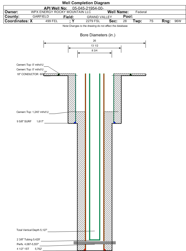 Wellbore #00 Wellbore Classification: GW Status: PR - 11/1/2015 Measured TD: 5775 ft. Vertical TD: 5127 ft.| Wellbore Data for Original Wellbore | Wellbore Classification: GW PR - 11/1/2015 | | Wellbore Permit | DIRECTIONAL | | Permit #: | | Expiration Date: | 3/28/2015 | | Proposed Top PZ Location: | Sec:28 Twp: 7S 96W | Footage: 2265 FNL 2302 FEL | | Bottom Hole Location: | Sec:28 Twp: 7S 96W | Footage: 2226 FNL 2377 FEL | | Proposed Depth/Form: | 5800 ft. | | Surface Mineral Owner Same: | Yes | | Mineral Owner: | FEDERAL | Surface Owner: | FEDERAL | | Unit: | | Unit Number: | | | Formation And Spacing: | Code: WMFK , Formation: WILLIAMS FORK , Order: 510-20 , Unit Acreage: , Drill Unit: | | Casing: | String Type: CONDUCTOR, Hole Size: 26 in., Size: 18 in., Top: 0 ft., Depth: 80 ft., Weight: 48# , Citings Type: PLANNED | | Cement: | Sacks: 50, Top: 0 ft., Bottom: 80 ft. | | Casing: | String Type: SURF, Hole Size: 13.5 in., Size: 9.625 in., Top: 0 ft., Depth: 1609 ft., Weight: 32.3# , Citings Type: PLANNED | | Cement: | Sacks: 416, Top: 0 ft., Bottom: 1609 ft. | | Casing: | String Type: 1ST, Hole Size: 8.75 in., Size: 4.5 in., Top: 0 ft., Depth: 5735 ft., Weight: 11.6# , Citings Type: PLANNED | | Cement: | Sacks: 747, Top: 2372 ft., Bottom: 5735 ft. |