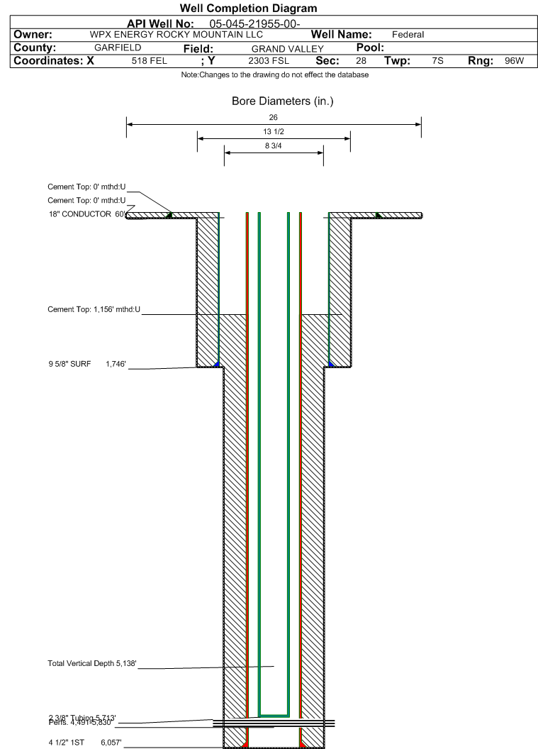 Wellbore #00 Wellbore Classification: GW Status: PR - 11/1/2015 Measured TD: 6068 ft. Vertical TD: 5138 ft.| Wellbore Data for Original Wellbore | Wellbore Classification: GW PR - 11/1/2015 | | Wellbore Permit | DIRECTIONAL | | Permit #: | | Expiration Date: | 3/28/2015 | | Proposed Top PZ Location: | Sec:28 Twp: 7S 96W | Footage: 1516 FNL 2370 FEL | | Bottom Hole Location: | Sec:28 Twp: 7S 96W | Footage: 1516 FNL 2370 FEL | | Proposed Depth/Form: | 5997 ft. | | Surface Mineral Owner Same: | Yes | | Mineral Owner: | FEDERAL | Surface Owner: | FEDERAL | | Unit: | | Unit Number: | | | Formation And Spacing: | Code: WMFK , Formation: WILLIAMS FORK , Order: 510-20 , Unit Acreage: , Drill Unit: | | Casing: | String Type: CONDUCTOR, Hole Size: 26 in., Size: 18 in., Top: 0 ft., Depth: 80 ft., Weight: 48# , Citings Type: PLANNED | | Cement: | Sacks: 50, Top: 0 ft., Bottom: 80 ft. | | Casing: | String Type: SURF, Hole Size: 13.5 in., Size: 9.625 in., Top: 0 ft., Depth: 1732 ft., Weight: 32.3# , Citings Type: PLANNED | | Cement: | Sacks: 447, Top: 0 ft., Bottom: 1732 ft. | | Casing: | String Type: 1ST, Hole Size: 8.75 in., Size: 4.5 in., Top: 0 ft., Depth: 6034 ft., Weight: 11.6# , Citings Type: PLANNED | | Cement: | Sacks: 747, Top: 2671 ft., Bottom: 6034 ft. |