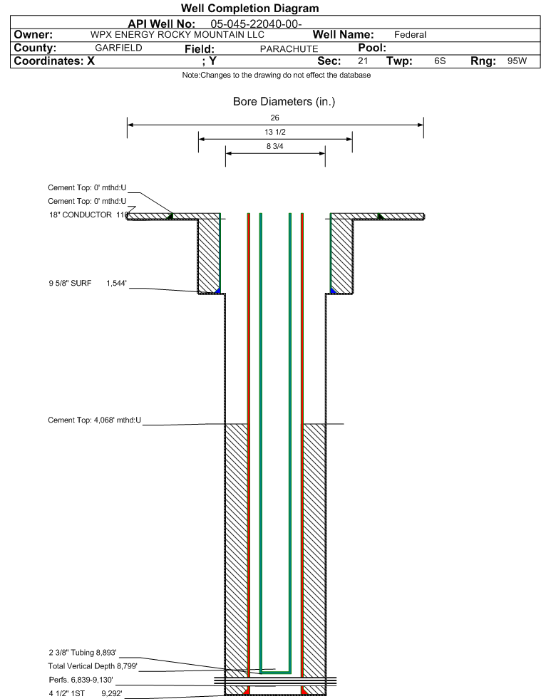 Wellbore #00 Wellbore Classification: GW Status: PR - 6/6/2014 Measured TD: 9302 ft. Vertical TD: 8799 ft.| Wellbore Data for Original Wellbore | Wellbore Classification: GW PR - 6/6/2014 | | Wellbore Permit | DIRECTIONAL | | Permit #: | | Expiration Date: | 4/28/2015 | | Proposed Top PZ Location: | Sec:21 Twp: 6S 95W | Footage: 1882 FNL 1539 FEL | | Bottom Hole Location: | Sec:21 Twp: 6S 95W | Footage: 1882 FNL 1539 FEL | | Proposed Depth/Form: | 9245 ft. | | Surface Mineral Owner Same: | Yes | | Mineral Owner: | FEDERAL | Surface Owner: | FEDERAL | | Unit: | | Unit Number: | | | Formation And Spacing: | Code: WMFK , Formation: WILLIAMS FORK , Order: 440-25 , Unit Acreage: , Drill Unit: | | Casing: | String Type: CONDUCTOR, Hole Size: 24 in., Size: 18 in., Top: 0 ft., Depth: 45 ft., Weight: 48 , Citings Type: PLANNED | | Cement: | Sacks: 50, Top: 0 ft., Bottom: 45 ft. | | Casing: | String Type: SURF, Hole Size: 13.5 in., Size: 9.625 in., Top: 0 ft., Depth: 1450 ft., Weight: 32.3 , Citings Type: PLANNED | | Cement: | Sacks: 377, Top: 0 ft., Bottom: 1450 ft. | | Casing: | String Type: 1ST, Hole Size: 8.75 in., Size: 4.5 in., Top: 0 ft., Depth: 9245 ft., Weight: 11.6 , Citings Type: PLANNED | | Cement: | Sacks: 904, Top: 5568 ft., Bottom: 9245 ft. |