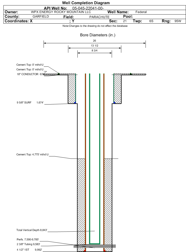 Wellbore #00 Wellbore Classification: GW Status: PR - 4/12/2014 Measured TD: 10005 ft. Vertical TD: 8843 ft.| Wellbore Data for Original Wellbore | Wellbore Classification: GW PR - 4/12/2014 | | Wellbore Permit | DIRECTIONAL | | Permit #: | | Expiration Date: | 4/28/2015 | | Proposed Top PZ Location: | Sec:21 Twp: 6S 95W | Footage: 1269 FNL 271 FEL | | Bottom Hole Location: | Sec:21 Twp: 6S 95W | Footage: 1269 FNL 271 FEL | | Proposed Depth/Form: | 10001 ft. | | Surface Mineral Owner Same: | Yes | | Mineral Owner: | FEDERAL | Surface Owner: | FEDERAL | | Unit: | | Unit Number: | | | Formation And Spacing: | Code: WMFK , Formation: WILLIAMS FORK , Order: 440-25 , Unit Acreage: , Drill Unit: | | Casing: | String Type: CONDUCTOR, Hole Size: 24 in., Size: 18 in., Top: 0 ft., Depth: 45 ft., Weight: 48 , Citings Type: PLANNED | | Cement: | Sacks: 50, Top: 0 ft., Bottom: 45 ft. | | Casing: | String Type: SURF, Hole Size: 13.5 in., Size: 9.625 in., Top: 0 ft., Depth: 1650 ft., Weight: 32.3 , Citings Type: PLANNED | | Cement: | Sacks: 427, Top: 0 ft., Bottom: 1650 ft. | | Casing: | String Type: 1ST, Hole Size: 8.75 in., Size: 4.5 in., Top: 0 ft., Depth: 10001 ft., Weight: 11.6 , Citings Type: PLANNED | | Cement: | Sacks: 908, Top: 6104 ft., Bottom: 10001 ft. |