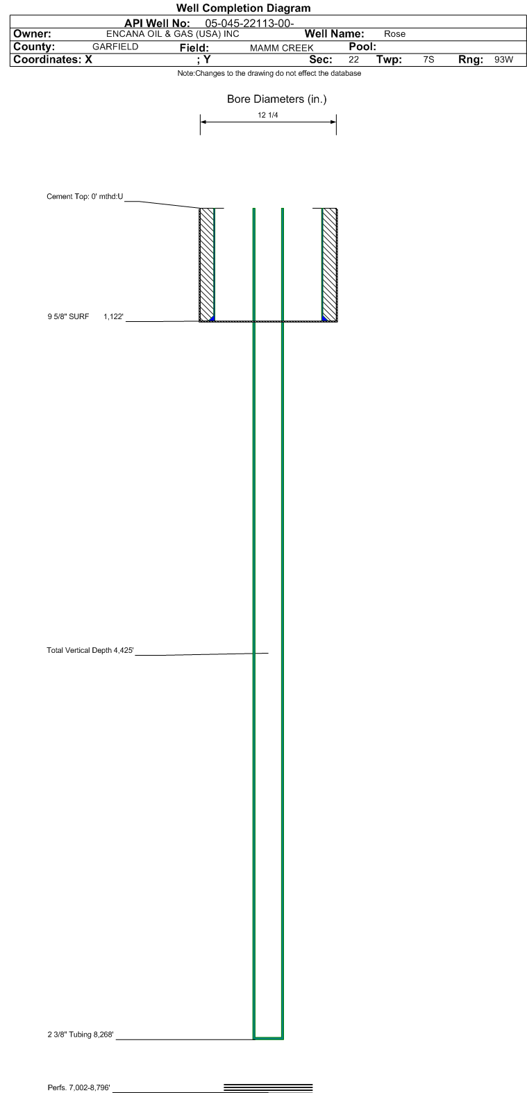 | Wellbore Completed | | Completion Date: | 11/22/2013 | | Spud Date: | 11/4/2013 | Spud Date Is: | ACTUAL | | Measured TD: | 9266 ft. | Measured PB depth: | 9123 ft. | | True Vertical TD: | 9026 ft. | True Vertical PB depth: | 8883 ft. | | Bottom Hole Location: | Sec:22 Twp: 7S 93W | Footage: 1944 FSL 1202 FEL | | Log Types: | CBL, RST, Mud, Temperature Logs | | Casing: | String Type: CONDUCTOR, Hole Size: 24 in., Size: 16 in., Top: 0 ft., Depth: 40 ft., Weight: , Citings Type: ACTUAL | | Cement: | Sacks: , Top: 0 ft., Bottom: 40 ft., Determination Method: VISU | | Casing: | String Type: SURF, Hole Size: 12.25 in., Size: 9.625 in., Top: 0 ft., Depth: 1122 ft., Weight: 36 , Citings Type: ACTUAL | | Cement: | Sacks: 423, Top: 0 ft., Bottom: 1122 ft., Determination Method: VISU | | Casing: | String Type: 1ST, Hole Size: 8.75 in., Size: 4.5 in., Top: 0 ft., Depth: 9231 ft., Weight: 11.6 , Citings Type: ACTUAL | | Cement: | Sacks: 845, Top: 2891 ft., Bottom: 9231 ft., Determination Method: CBL | | Formation | Interval Top | Log Bottom | Cored | DSTs | | WILLIAMS FORK | 5509 ft. | 8995 ft. | | | | ROLLINS | 8995 ft. | 9266 ft. | | | | No formation data to display. |