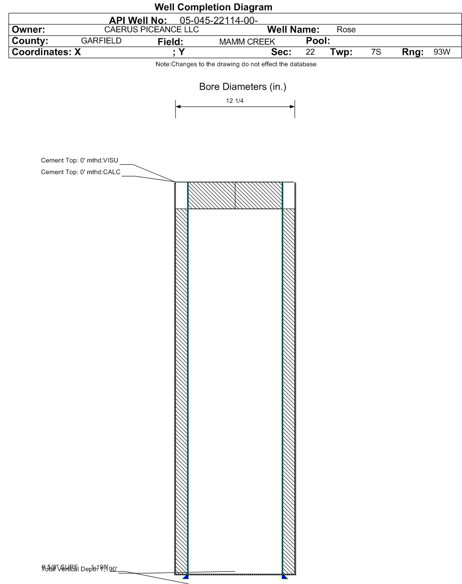 | Wellbore Completed | | Completion Date: | 10/30/2013 | | Spud Date: | 10/29/2013 | Spud Date Is: | ACTUAL | | Measured TD: | 1210 ft. | Measured PB depth: | 1152 ft. | | True Vertical TD: | 1190 ft. | True Vertical PB depth: | 1132 ft. | | Bottom Hole Location: | Sec:22 Twp: 7S 93W | Footage: 2493 FSL 2304 FWL | | Log Types: | No logs ran | | Casing: | String Type: CONDUCTOR, Hole Size: , Size: , Top: 0 ft., Depth: 82 ft., Weight: 42# , Citings Type: ACTUAL | | Cement: | Sacks: 114, Top: 0 ft., Bottom: 82 ft., Determination Method: CALC | | Casing: | String Type: SURF, Hole Size: 12.25 in., Size: 9.625 in., Top: 0 ft., Depth: 1198 ft., Weight: 36# , Citings Type: ACTUAL | | Cement: | Sacks: 445, Top: 0 ft., Bottom: 1198 ft., Determination Method: VISU | | No formation data to display. |