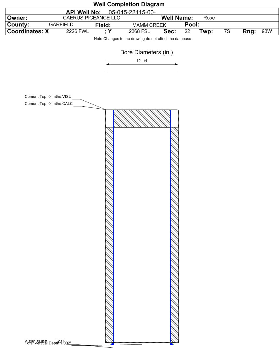 Wellbore #00 Wellbore Classification: GW Status: PA - 9/22/2020 Measured TD: 1095 ft. Vertical TD: 1092 ft.| Wellbore Data for Original Wellbore | Wellbore Classification: GW PA - 9/22/2020 | | Wellbore Permit | DIRECTIONAL | | Permit #: | | Expiration Date: | 7/25/2015 | | Proposed Top PZ Location: | Sec:22 Twp: 7S 93W | Footage: 2214 FNL 2211 FWL | | Bottom Hole Location: | Sec:22 Twp: 7S 93W | Footage: 2248 FNL 2127 FWL | | Proposed Depth/Form: | 9231 ft. | | Surface Mineral Owner Same: | No | | Mineral Owner: | FEE | Surface Owner: | FEE | | Unit: | Middleton Creek | Unit Number: | COC068997X | | Formation And Spacing: | Code: WMFK , Formation: WILLIAMS FORK , Order: 191-83 , Unit Acreage: , Drill Unit: | | Casing: | String Type: CONDUCTOR, Hole Size: 26 in., Size: 16 in., Top: 0 ft., Depth: 82 ft., Weight: 42# , Citings Type: PLANNED | | Cement: | Sacks: 114, Top: 0 ft., Bottom: 82 ft. | | Casing: | String Type: SURF, Hole Size: 12.25 in., Size: 9.625 in., Top: 0 ft., Depth: 1081 ft., Weight: 36# , Citings Type: PLANNED | | Cement: | Sacks: 413, Top: 0 ft., Bottom: 1081 ft. | | Casing: | String Type: 1ST, Hole Size: 8.75 in., Size: 4.5 in., Top: 0 ft., Depth: 9013 ft., Weight: 11.6# , Citings Type: PLANNED | | Cement: | Sacks: 935, Top: 3726 ft., Bottom: 9013 ft. |
