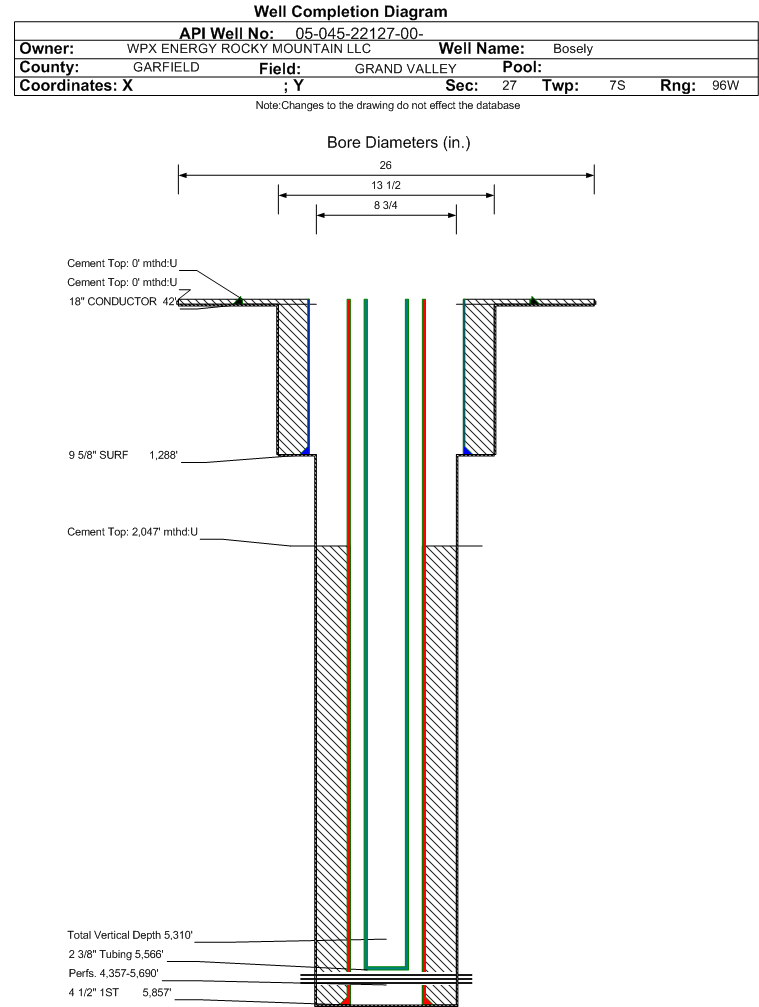 Wellbore #00 Wellbore Classification: GW Status: PR - 3/11/2014 Measured TD: 5870 ft. Vertical TD: 5310 ft.| Wellbore Data for Original Wellbore | Wellbore Classification: GW PR - 3/11/2014 | | Wellbore Permit | DIRECTIONAL | | Permit #: | | Expiration Date: | 8/9/2015 | | Proposed Top PZ Location: | Sec:27 Twp: 7S 96W | Footage: 128 FNL 145 FWL | | Bottom Hole Location: | Sec:27 Twp: 7S 96W | Footage: 128 FNL 145 FWL | | Proposed Depth/Form: | 5837 ft. | | Surface Mineral Owner Same: | No | | Mineral Owner: | FEE | Surface Owner: | FEE | | Unit: | | Unit Number: | | | Formation And Spacing: | Code: WMFK , Formation: WILLIAMS FORK , Order: 510-14 , Unit Acreage: , Drill Unit: | | Casing: | String Type: CONDUCTOR, Hole Size: 26 in., Size: 18 in., Top: 0 ft., Depth: 80 ft., Weight: 48# , Citings Type: PLANNED | | Cement: | Sacks: 50, Top: 0 ft., Bottom: 80 ft. | | Casing: | String Type: SURF, Hole Size: 13.5 in., Size: 9.625 in., Top: 0 ft., Depth: 1289 ft., Weight: 32.3# , Citings Type: PLANNED | | Cement: | Sacks: 337, Top: 0 ft., Bottom: 1289 ft. | | Casing: | String Type: 1ST, Hole Size: 8.75 in., Size: 4.5 in., Top: 0 ft., Depth: 5837 ft., Weight: 11.6# , Citings Type: PLANNED | | Cement: | Sacks: 743, Top: , Bottom: 5837 ft. |