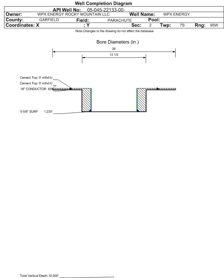 | Wellbore Completed | | Completion Date: | 5/16/2014 | | Spud Date: | 5/12/2014 | Spud Date Is: | ACTUAL | | Measured TD: | 3585 ft. | Measured PB depth: | 1810 ft. | | True Vertical TD: | | True Vertical PB depth: | | | Bottom Hole Location: | Sec:3 Twp: 7S 95W | Footage: 2382 FSL 365 FEL | | Log Types: | | | Casing: | String Type: CONDUCTOR, Hole Size: 26 in., Size: 18 in., Top: 0 ft., Depth: 69 ft., Weight: 48 , Citings Type: ACTUAL | | Cement: | Sacks: 26, Top: 0 ft., Bottom: 69 ft., Determination Method: VISU | | Casing: | String Type: SURF, Hole Size: 13.5 in., Size: 9.625 in., Top: 0 ft., Depth: 1230 ft., Weight: 32.3 , Citings Type: ACTUAL | | Cement: | Sacks: 325, Top: 0 ft., Bottom: 1230 ft., Determination Method: VISU | | No formation data to display. |