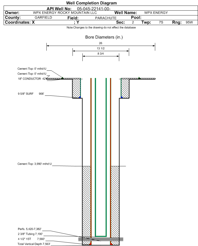 | Wellbore Completed | | Completion Date: | 2/16/2014 | | Spud Date: | 2/10/2014 | Spud Date Is: | ACTUAL | | Measured TD: | 7635 ft. | Measured PB depth: | 7560 ft. | | True Vertical TD: | 7563 ft. | True Vertical PB depth: | 7488 ft. | | Top PZ Location: | Sec:2 Twp: 7S 95W | Footage: 2457 FNL 1084 FWL | | Bottom Hole Location: | Sec:2 Twp: 7S 95W | Footage: 2437 FNL 1043 FWL | | Log Types: | CBL, Mud, and Reservoir Performance Monitor (RPM) | | Casing: | String Type: CONDUCTOR, Hole Size: 26 in., Size: 18 in., Top: 0 ft., Depth: 42 ft., Weight: 48 , Citings Type: ACTUAL | | Cement: | Sacks: 16, Top: 0 ft., Bottom: 42 ft., Determination Method: VISU | | Casing: | String Type: SURF, Hole Size: 13.5 in., Size: 9.625 in., Top: 0 ft., Depth: 906 ft., Weight: 32.3 , Citings Type: ACTUAL | | Cement: | Sacks: 245, Top: 0 ft., Bottom: 906 ft., Determination Method: VISU | | Casing: | String Type: 1ST, Hole Size: 8.75 in., Size: 4.5 in., Top: 0 ft., Depth: 7560 ft., Weight: 11.6 , Citings Type: ACTUAL | | Cement: | Sacks: 1400, Top: 3990 ft., Bottom: 7560 ft., Determination Method: CBL | | Formation | Interval Top | Log Bottom | Cored | DSTs | | WASATCH G | 1997 ft. | | | | | MESAVERDE | 4117 ft. | | | | | CAMEO | 6532 ft. | | | | | ROLLINS | 7470 ft. | | | |