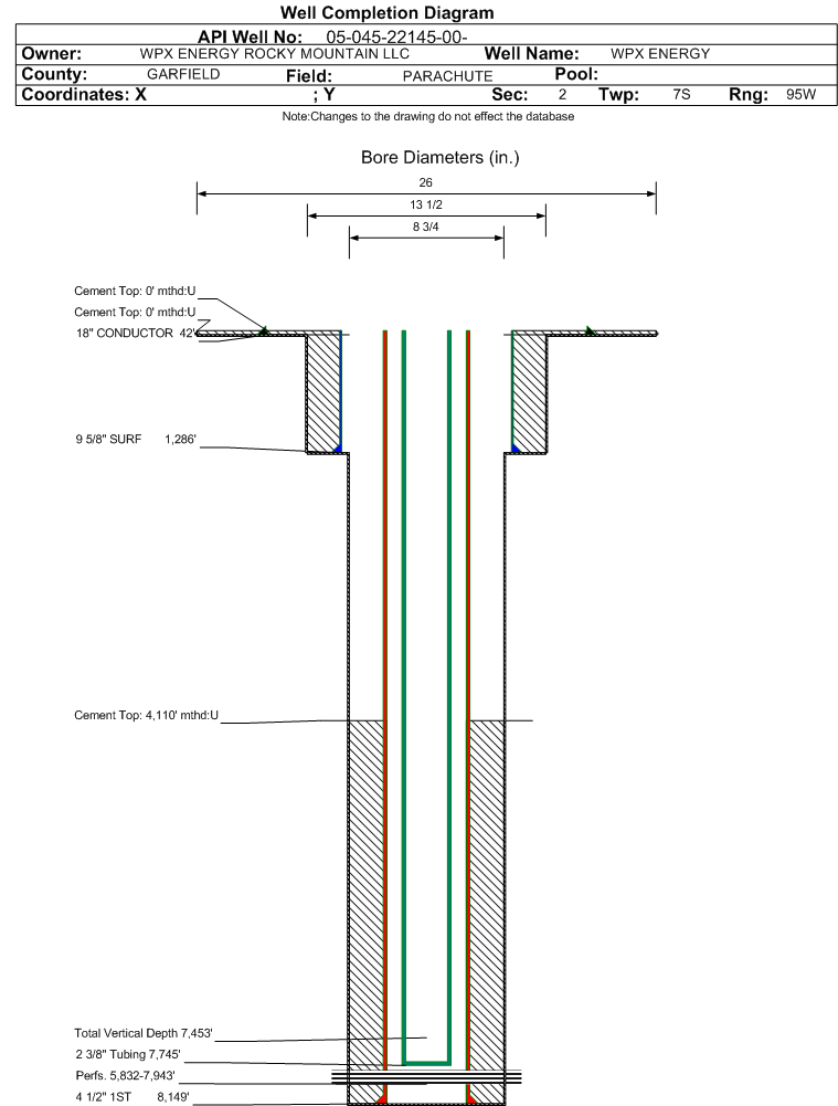 | Wellbore Completed | | Completion Date: | 5/28/2014 | | Spud Date: | 5/22/2014 | Spud Date Is: | ACTUAL | | Measured TD: | 8165 ft. | Measured PB depth: | 8102 ft. | | True Vertical TD: | 7453 ft. | True Vertical PB depth: | 7390 ft. | | Top PZ Location: | Sec:3 Twp: 7S 95W | Footage: 2168 FSL 996 FEL | | Bottom Hole Location: | Sec:3 Twp: 7S 95W | Footage: 2118 FSL 1080 FEL | | Log Types: | CBL, Mud, and Reservoir Performance Monitor (RPM) | | Casing: | String Type: CONDUCTOR, Hole Size: 26 in., Size: 18 in., Top: 0 ft., Depth: 42 ft., Weight: 48 , Citings Type: ACTUAL | | Cement: | Sacks: 16, Top: 0 ft., Bottom: 42 ft., Determination Method: VISU | | Casing: | String Type: SURF, Hole Size: 13.5 in., Size: 9.625 in., Top: 0 ft., Depth: 1286 ft., Weight: 32.3 , Citings Type: ACTUAL | | Cement: | Sacks: 340, Top: 0 ft., Bottom: 1286 ft., Determination Method: VISU | | Casing: | String Type: 1ST, Hole Size: 8.75 in., Size: 4.5 in., Top: 0 ft., Depth: 8149 ft., Weight: 11.6 , Citings Type: ACTUAL | | Cement: | Sacks: 1475, Top: 4110 ft., Bottom: 8149 ft., Determination Method: CBL | | Formation | Interval Top | Log Bottom | Cored | DSTs | | WASATCH G | 2244 ft. | | | | | MESAVERDE | 4645 ft. | | | | | CAMEO | 7050 ft. | | | | | ROLLINS | 7975 ft. | | | |