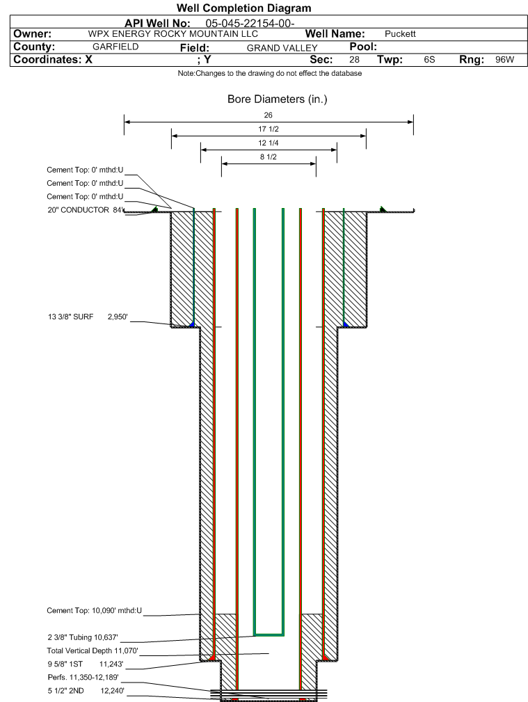 | Wellbore Completed | | Completion Date: | 12/22/2013 | | Spud Date: | 11/10/2013 | Spud Date Is: | ACTUAL | | Measured TD: | 12252 ft. | Measured PB depth: | 12236 ft. | | True Vertical TD: | 11070 ft. | True Vertical PB depth: | 10985 ft. | | Top PZ Location: | Sec:28 Twp: 6S 96W | Footage: 621 FNL 955 FWL | | Bottom Hole Location: | Sec:21 Twp: 6S 96W | Footage: 284 FSL 920 FWL | | Log Types: | SP/GR/HDIL/ZDL/CN/CBL/MUDLOGS