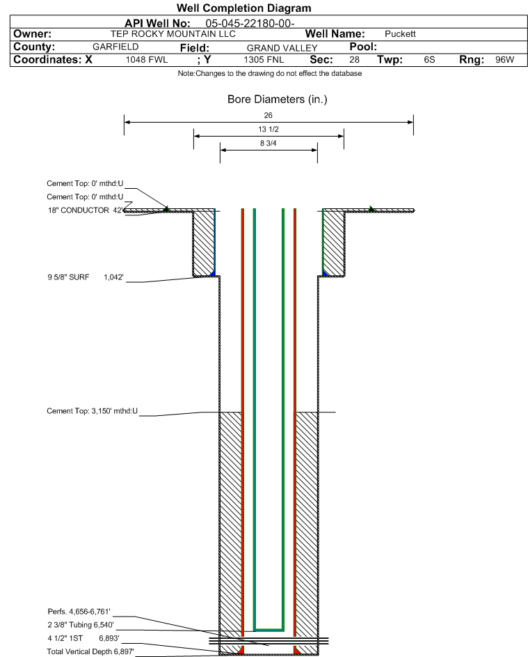 | Wellbore Completed | | Completion Date: | 11/24/2014 | | Spud Date: | 11/17/2014 | Spud Date Is: | ACTUAL | | Measured TD: | 6913 ft. | Measured PB depth: | 6868 ft. | | True Vertical TD: | 6897 ft. | True Vertical PB depth: | 6852 ft. | | Top PZ Location: | Sec:28 Twp: 6S 96W | Footage: 1257 FNL 1403 FWL | | Bottom Hole Location: | Sec:28 Twp: 6S 96W | Footage: 1260 FNL 1393 FWL | | Log Types: | RPM/MUD/CBL/Triple Combo on the Puckett GM 314-21 API#045-22187 | | Casing: | String Type: CONDUCTOR, Hole Size: 26 in., Size: 18 in., Top: 0 ft., Depth: 42 ft., Weight: 48 , Citings Type: ACTUAL | | Cement: | Sacks: 16, Top: 0 ft., Bottom: 42 ft., Determination Method: VISU | | Casing: | String Type: SURF, Hole Size: 13.5 in., Size: 9.625 in., Top: 0 ft., Depth: 1042 ft., Weight: 32.3 , Citings Type: ACTUAL | | Cement: | Sacks: 285, Top: 0 ft., Bottom: 1042 ft., Determination Method: VISU | | Casing: | String Type: 1ST, Hole Size: 8.75 in., Size: 4.5 in., Top: 0 ft., Depth: 6893 ft., Weight: 11.6 , Citings Type: ACTUAL | | Cement: | Sacks: 1075, Top: 3150 ft., Bottom: 6893 ft., Determination Method: CBL | | Formation | Interval Top | Log Bottom | Cored | DSTs | | WASATCH G | 2076 ft. | | | | | MESAVERDE | 3735 ft. | | | | | WILLIAMS FORK | 3735 ft. | | | | | CAMEO | 6307 ft. | | | | | ROLLINS | 6799 ft. | | | |