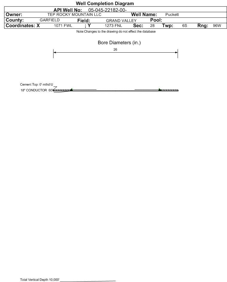 Casing:String Type: CONDUCTOR, Hole Size: 26 in., Size: 18 in., Top: 0 ft., Depth: 60 ft., Weight: 48# , Citings Type: PLANNED