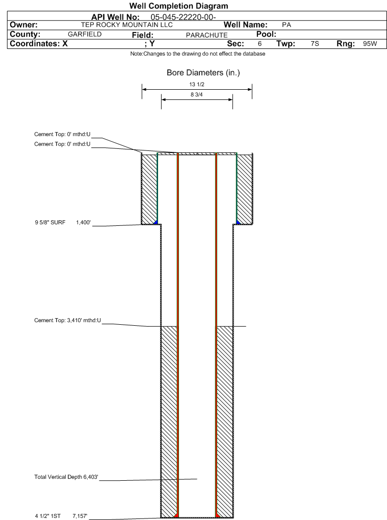 Wellbore #00 Wellbore Classification: GW Status: PA - 10/7/2016 Measured TD: 7166 ft. Vertical TD: 6403 ft.| Wellbore Data for Original Wellbore | Wellbore Classification: GW PA - 10/7/2016 | | Wellbore Permit | DIRECTIONAL | | Permit #: | | Expiration Date: | 11/22/2015 | | Proposed Top PZ Location: | Sec:7 Twp: 7S 95W | Footage: 1688 FNL 1258 FWL | | Bottom Hole Location: | Sec:7 Twp: 7S 95W | Footage: 1688 FNL 1258 FWL | | Proposed Depth/Form: | 7249 ft. | | Surface Mineral Owner Same: | No | | Mineral Owner: | FEE | Surface Owner: | FEE | | Unit: | | Unit Number: | | | Formation And Spacing: | Code: WMFK , Formation: WILLIAMS FORK , Order: 440-61 , Unit Acreage: 10, Drill Unit: N 1/2 | | Casing: | String Type: CONDUCTOR, Hole Size: 26 in., Size: 18 in., Top: 0 ft., Depth: 60 ft., Weight: 48 , Citings Type: PLANNED | | Cement: | Sacks: 50, Top: 0 ft., Bottom: 60 ft. | | Casing: | String Type: SURF, Hole Size: 13.5 in., Size: 9.625 in., Top: 0 ft., Depth: 1374 ft., Weight: 32.3 , Citings Type: PLANNED | | Cement: | Sacks: 358, Top: 0 ft., Bottom: 1374 ft. | | Casing: | String Type: 1ST, Hole Size: 8.75 in., Size: 4.5 in., Top: 0 ft., Depth: 7169 ft., Weight: 11 , Citings Type: PLANNED | | Cement: | Sacks: 815, Top: 3789 ft., Bottom: 7169 ft. |