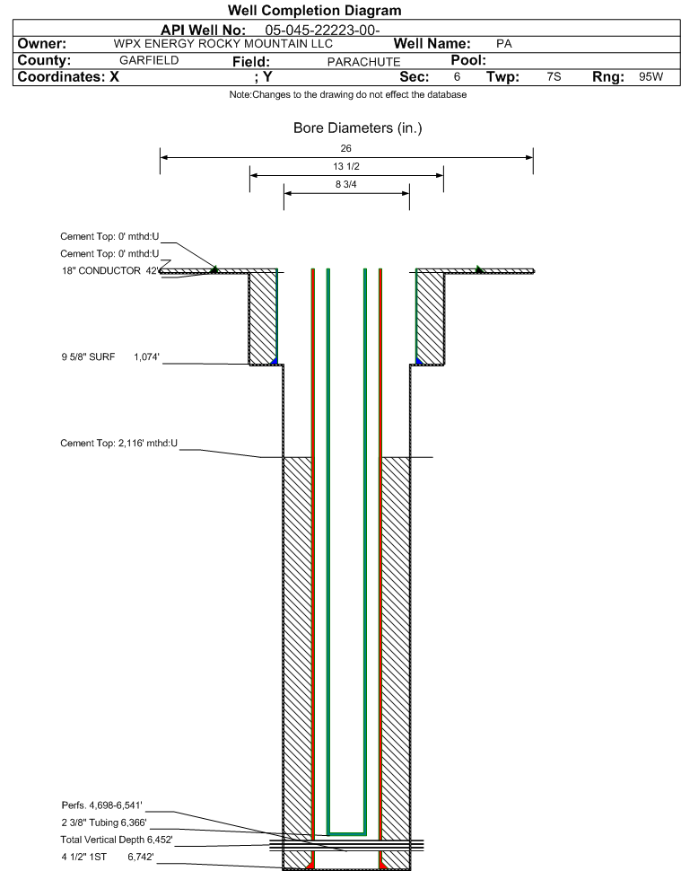 Wellbore #00 Wellbore Classification: GW Status: PR - 4/13/2014 Measured TD: 6750 ft. Vertical TD: 6452 ft.| Wellbore Data for Original Wellbore | Wellbore Classification: GW PR - 4/13/2014 | | Wellbore Permit | DIRECTIONAL | | Permit #: | | Expiration Date: | 11/22/2015 | | Proposed Top PZ Location: | Sec:7 Twp: S 95W | Footage: 499 FNL 1620 FWL | | Bottom Hole Location: | Sec:7 Twp: 7S 95W | Footage: 499 FNL 1620 FWL | | Proposed Depth/Form: | 6799 ft. | | Surface Mineral Owner Same: | No | | Mineral Owner: | FEE | Surface Owner: | FEE | | Unit: | | Unit Number: | | | Formation And Spacing: | Code: WMFK , Formation: WILLIAMS FORK , Order: 440-61 , Unit Acreage: 10, Drill Unit: N 1/2 | | Casing: | String Type: CONDUCTOR, Hole Size: 26 in., Size: 18 in., Top: 0 ft., Depth: 60 ft., Weight: 48 , Citings Type: PLANNED | | Cement: | Sacks: 50, Top: 0 ft., Bottom: 60 ft. | | Casing: | String Type: SURF, Hole Size: 13.5 in., Size: 8.625 in., Top: 0 ft., Depth: 1069 ft., Weight: 32.3 , Citings Type: PLANNED | | Cement: | Sacks: 283, Top: 0 ft., Bottom: 1069 ft. | | Casing: | String Type: 1ST, Hole Size: 8.75 in., Size: 4.5 in., Top: 0 ft., Depth: 6771 ft., Weight: 11 , Citings Type: PLANNED | | Cement: | Sacks: 810, Top: 3416 ft., Bottom: 6771 ft. |
