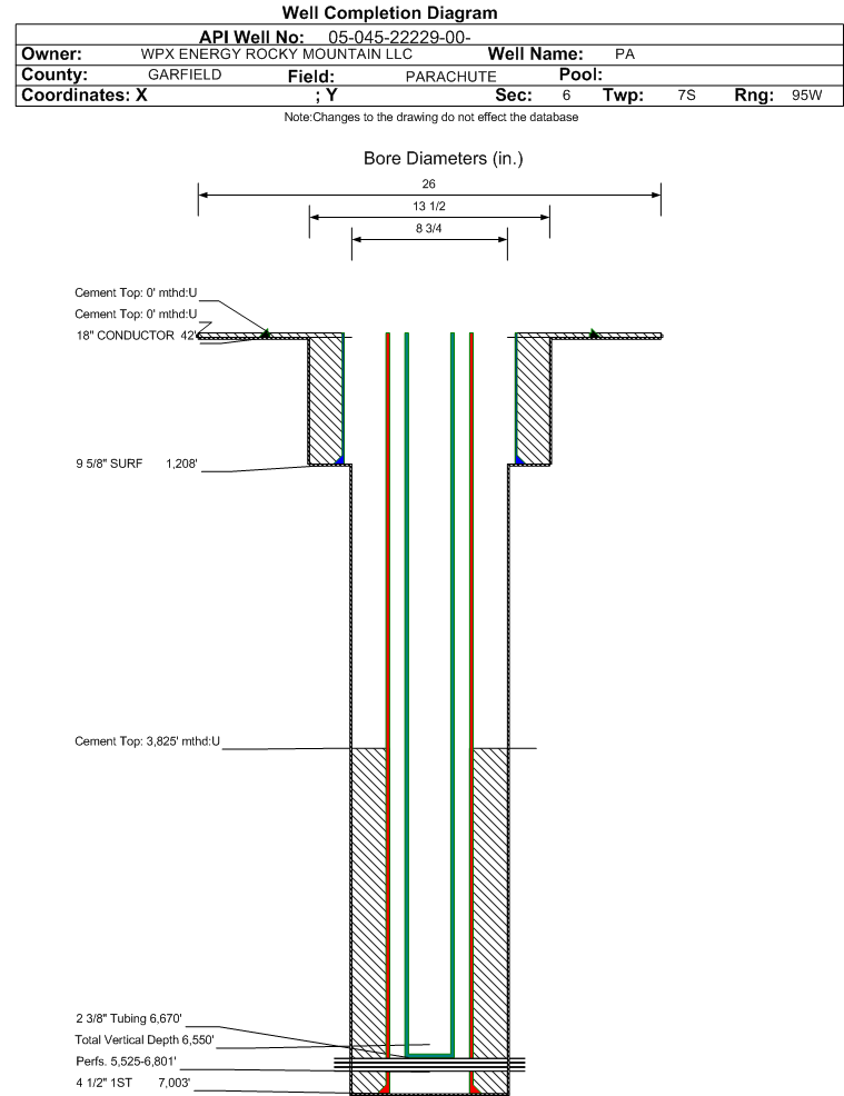 Wellbore #00 Wellbore Classification: GW Status: PR - 8/7/2014 Measured TD: 7012 ft. Vertical TD: 6550 ft.| Wellbore Data for Original Wellbore | Wellbore Classification: GW PR - 8/7/2014 | | Wellbore Permit | DIRECTIONAL | | Permit #: | | Expiration Date: | 11/22/2015 | | Proposed Top PZ Location: | Sec:6 Twp: 7S 95W | Footage: 2474 FSL 1391 FWL | | Bottom Hole Location: | Sec:6 Twp: 7S 95W | Footage: 2474 FSL 1391 FWL | | Proposed Depth/Form: | 7017 ft. | | Surface Mineral Owner Same: | No | | Mineral Owner: | FEE | Surface Owner: | FEE | | Unit: | | Unit Number: | | | Formation And Spacing: | Code: WMFK , Formation: WILLIAMS FORK , Order: 440-46 , Unit Acreage: 320, Drill Unit: S/20 | | Casing: | String Type: CONDUCTOR, Hole Size: 26 in., Size: 18 in., Top: 0 ft., Depth: 60 ft., Weight: 48 , Citings Type: PLANNED | | Cement: | Sacks: 50, Top: 0 ft., Bottom: 60 ft. | | Casing: | String Type: SURF, Hole Size: 13.5 in., Size: 9.625 in., Top: 0 ft., Depth: 1156 ft., Weight: 32.3 , Citings Type: PLANNED | | Cement: | Sacks: 304, Top: 0 ft., Bottom: 1156 ft. | | Casing: | String Type: 1ST, Hole Size: 8.75 in., Size: 4.5 in., Top: 0 ft., Depth: 7017 ft., Weight: 11.6 , Citings Type: PLANNED | | Cement: | Sacks: 818, Top: 3619 ft., Bottom: 7017 ft. |