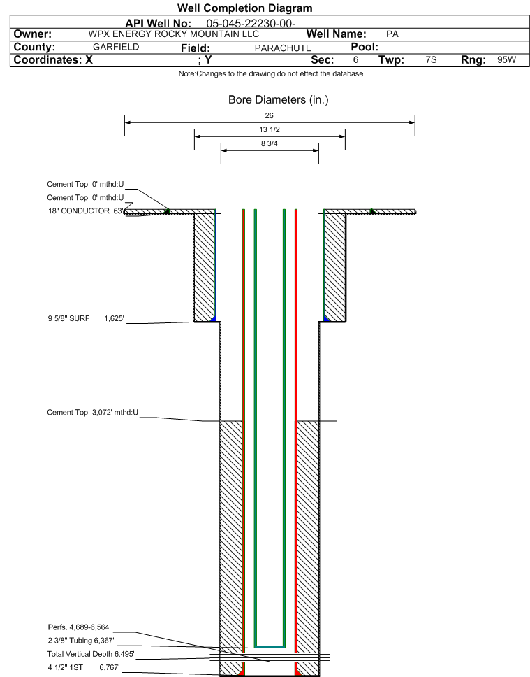 Wellbore #00 Wellbore Classification: GW Status: PR - 4/13/2014 Measured TD: 6782 ft. Vertical TD: 6495 ft.| Wellbore Data for Original Wellbore | Wellbore Classification: GW PR - 4/13/2014 | | Wellbore Permit | DIRECTIONAL | | Permit #: | | Expiration Date: | 11/22/2015 | | Proposed Top PZ Location: | Sec:7 Twp: 7S 95W | Footage: 190 FNL 1832 FWL | | Bottom Hole Location: | Sec:7 Twp: 7S 95W | Footage: 190 FNL 1832 FWL | | Proposed Depth/Form: | 6763 ft. | | Surface Mineral Owner Same: | No | | Mineral Owner: | FEE | Surface Owner: | FEE | | Unit: | | Unit Number: | | | Formation And Spacing: | Code: WMFK , Formation: WILLIAMS FORK , Order: 440-61 , Unit Acreage: 320, Drill Unit: N/2 | | Casing: | String Type: CONDUCTOR, Hole Size: 26 in., Size: 18 in., Top: 0 ft., Depth: 60 ft., Weight: 48 , Citings Type: PLANNED | | Cement: | Sacks: 50, Top: 0 ft., Bottom: 60 ft. | | Casing: | String Type: SURF, Hole Size: 13.5 in., Size: 9.625 in., Top: 0 ft., Depth: 1358 ft., Weight: 32.3 , Citings Type: PLANNED | | Cement: | Sacks: 354, Top: 0 ft., Bottom: 1358 ft. | | Casing: | String Type: 1ST, Hole Size: 8.75 in., Size: 4.5 in., Top: 0 ft., Depth: 6763 ft., Weight: 11.6 , Citings Type: PLANNED | | Cement: | Sacks: 810, Top: 3408 ft., Bottom: 6763 ft. |