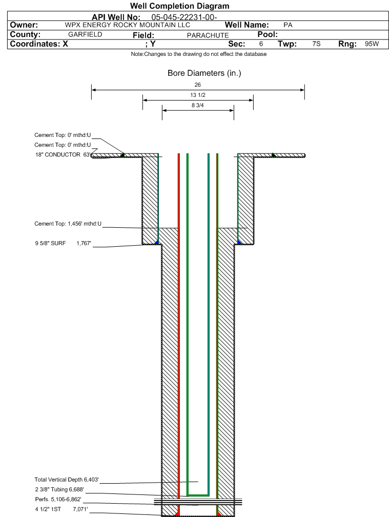 Wellbore #00 Wellbore Classification: GW Status: PR - 8/7/2014 Measured TD: 7081 ft. Vertical TD: 6403 ft.| Wellbore Data for Original Wellbore | Wellbore Classification: GW PR - 8/7/2014 | | Wellbore Permit | DIRECTIONAL | | Permit #: | | Expiration Date: | 11/22/2015 | | Proposed Top PZ Location: | Sec:7 Twp: 7S 95W | Footage: 1490 FNL 747 FWL | | Bottom Hole Location: | Sec:7 Twp: 7S 95W | Footage: 1490 FNL 747 FWL | | Proposed Depth/Form: | 7133 ft. | | Surface Mineral Owner Same: | No | | Mineral Owner: | FEE | Surface Owner: | FEE | | Unit: | | Unit Number: | | | Formation And Spacing: | Code: WMFK , Formation: WILLIAMS FORK , Order: 440-61 , Unit Acreage: 10, Drill Unit: N 1/2 | | Casing: | String Type: CONDUCTOR, Hole Size: 26 in., Size: 18 in., Top: 0 ft., Depth: 60 ft., Weight: 48 , Citings Type: PLANNED | | Cement: | Sacks: 50, Top: 0 ft., Bottom: 60 ft. | | Casing: | String Type: SURF, Hole Size: 13.5 in., Size: 9.625 in., Top: 0 ft., Depth: 1533 ft., Weight: 32.3 , Citings Type: PLANNED | | Cement: | Sacks: 398, Top: 0 ft., Bottom: 1533 ft. | | Casing: | String Type: 1ST, Hole Size: 8.75 in., Size: 4.5 in., Top: 0 ft., Depth: 7106 ft., Weight: 11 , Citings Type: PLANNED | | Cement: | Sacks: 808, Top: 3765 ft., Bottom: 7106 ft. |