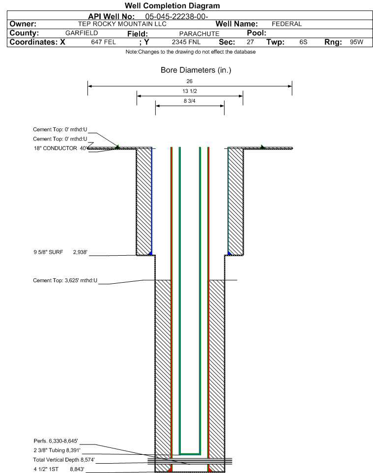| Wellbore Completed | | Completion Date: | 12/4/2014 | | Spud Date: | 11/27/2014 | Spud Date Is: | ACTUAL | | Measured TD: | 8851 ft. | Measured PB depth: | 8812 ft. | | True Vertical TD: | 8574 ft. | True Vertical PB depth: | 8535 ft. | | Top PZ Location: | Sec:27 Twp: 6S 95W | Footage: 602 FNL 261 FEL | | Bottom Hole Location: | Sec:27 Twp: 6S 95W | Footage: 594 FNL 270 FEL | | Log Types: | CBL/MUD/RPM/Triple Combo on 045-22239 | | Casing: | String Type: CONDUCTOR, Hole Size: 26 in., Size: 18 in., Top: 0 ft., Depth: 40 ft., Weight: 48 , Citings Type: ACTUAL | | Cement: | Sacks: 15, Top: 0 ft., Bottom: 40 ft., Determination Method: VISU | | Casing: | String Type: SURF, Hole Size: 13.5 in., Size: 9.625 in., Top: 0 ft., Depth: 2938 ft., Weight: 32.3 , Citings Type: ACTUAL | | Cement: | Sacks: 605, Top: 0 ft., Bottom: 2938 ft., Determination Method: VISU | | Casing: | String Type: 1ST, Hole Size: 8.75 in., Size: 4.5 in., Top: 0 ft., Depth: 8843 ft., Weight: 11.6 , Citings Type: ACTUAL | | Cement: | Sacks: 1065, Top: 3625 ft., Bottom: 8843 ft., Determination Method: CBL | | Formation | Interval Top | Log Bottom | Cored | DSTs | | WASATCH G | 2705 ft. | | | | | MESAVERDE | 5140 ft. | | | | | WILLIAMS FORK | 5140 ft. | | | | | CAMEO | 8108 ft. | | | | | ROLLINS | 8709 ft. | | | |