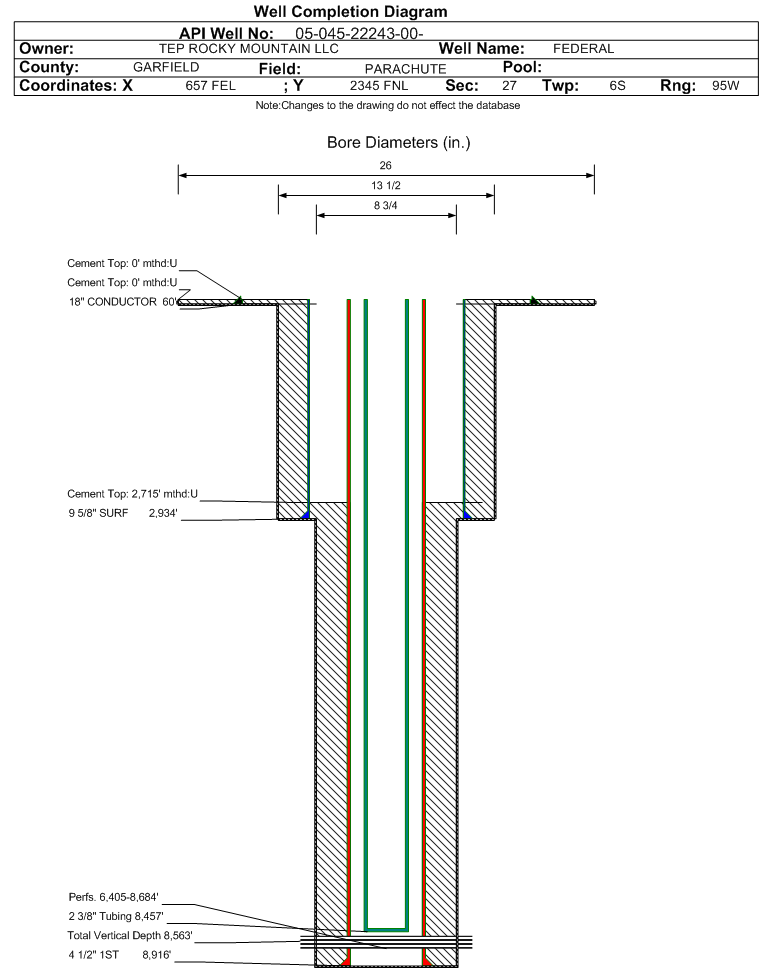 | Wellbore Completed | | Completion Date: | 12/12/2014 | | Spud Date: | 12/4/2014 | Spud Date Is: | ACTUAL | | Measured TD: | 8925 ft. | Measured PB depth: | 8814 ft. | | True Vertical TD: | 8563 ft. | True Vertical PB depth: | 8452 ft. | | Top PZ Location: | Sec:27 Twp: 6S 95W | Footage: 564 FNL 1555 FEL | | Bottom Hole Location: | Sec:27 Twp: 6S 95W | Footage: 548 FNL 1603 FEL | | Log Types: | CBL/MUD/RPM/No OH logs/OH logs on the Federal PA 41-27(045-22239) | | Casing: | String Type: CONDUCTOR, Hole Size: 26 in., Size: 18 in., Top: 0 ft., Depth: 60 ft., Weight: 47.4 , Citings Type: ACTUAL | | Cement: | Sacks: 22, Top: 0 ft., Bottom: 60 ft., Determination Method: VISU | | Casing: | String Type: SURF, Hole Size: 13.5 in., Size: 9.625 in., Top: 0 ft., Depth: 2934 ft., Weight: 32.3 , Citings Type: ACTUAL | | Cement: | Sacks: 555, Top: 0 ft., Bottom: 2934 ft., Determination Method: VISU | | Casing: | String Type: 1ST, Hole Size: 8.75 in., Size: 4.5 in., Top: 0 ft., Depth: 8916 ft., Weight: 11.6 , Citings Type: ACTUAL | | Cement: | Sacks: 1085, Top: 2715 ft., Bottom: 8916 ft., Determination Method: CBL | | Formation | Interval Top | Log Bottom | Cored | DSTs | | WASATCH G | 2730 ft. | | | | | MESAVERDE | 5140 ft. | | | | | WILLIAMS FORK | 5140 ft. | | | | | CAMEO | 8040 ft. | | | | | ROLLINS | 8750 ft. | | | |