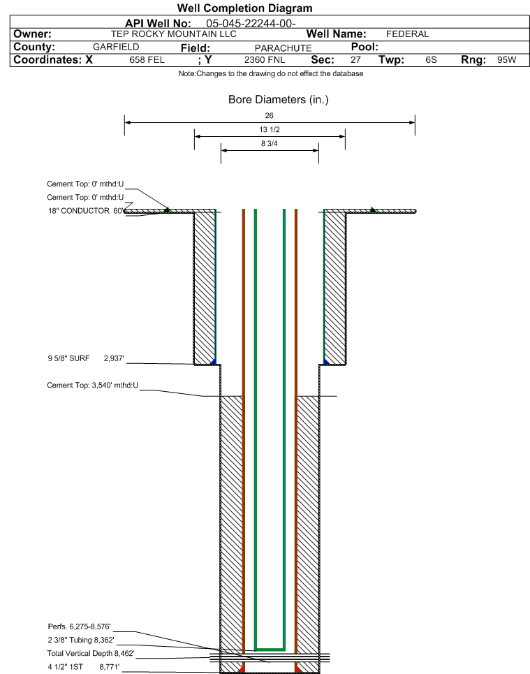 | Wellbore Completed | | Completion Date: | 11/10/2014 | | Spud Date: | 11/2/2014 | Spud Date Is: | ACTUAL | | Measured TD: | 8781 ft. | Measured PB depth: | 8741 ft. | | True Vertical TD: | 8462 ft. | True Vertical PB depth: | 8422 ft. | | Top PZ Location: | Sec:27 Twp: 6S 95W | Footage: 1301 FNL 2189 FEL | | Bottom Hole Location: | Sec:27 Twp: 6S 95W | Footage: 1311 FNL 2194 FEL | | Log Types: | CBL/MUD/RPM/No OH logs/OH logs on the FEDERAL PA 41-27(045-22239) | | Casing: | String Type: CONDUCTOR, Hole Size: 26 in., Size: 18 in., Top: 0 ft., Depth: 60 ft., Weight: 48 , Citings Type: ACTUAL | | Cement: | Sacks: 22, Top: 0 ft., Bottom: 60 ft., Determination Method: VISU | | Casing: | String Type: SURF, Hole Size: 13.5 in., Size: 9.625 in., Top: 0 ft., Depth: 2937 ft., Weight: 32.3 , Citings Type: ACTUAL | | Cement: | Sacks: 555, Top: 0 ft., Bottom: 2937 ft., Determination Method: VISU | | Casing: | String Type: 1ST, Hole Size: 8.75 in., Size: 4.5 in., Top: 0 ft., Depth: 8771 ft., Weight: 11.6 , Citings Type: ACTUAL | | Cement: | Sacks: 1055, Top: 3540 ft., Bottom: 8771 ft., Determination Method: CBL | | Formation | Interval Top | Log Bottom | Cored | DSTs | | WASATCH G | 2676 ft. | | | | | MESAVERDE | 5138 ft. | | | | | WILLIAMS FORK | 5138 ft. | | | | | CAMEO | 7989 ft. | | | | | ROLLINS | 8638 ft. | | | |