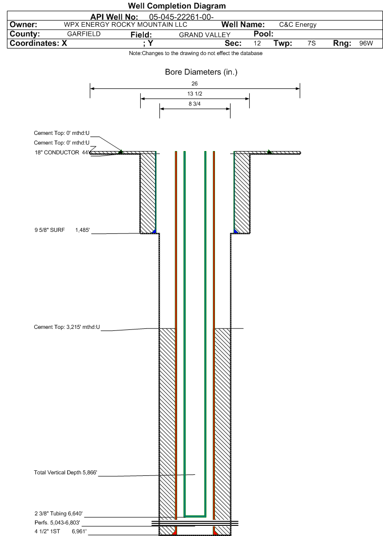 Wellbore #00 Wellbore Classification: GW Status: PR - 10/1/2014 Measured TD: 6975 ft. Vertical TD: 5866 ft.| Wellbore Data for Original Wellbore | Wellbore Classification: GW PR - 10/1/2014 | | Wellbore Permit | DIRECTIONAL | | Permit #: | | Expiration Date: | 12/14/2015 | | Proposed Top PZ Location: | Sec:13 Twp: 7S 96W | Footage: 2512 FNL 209 FWL | | Bottom Hole Location: | Sec:13 Twp: 7S 96W | Footage: 2512 FNL 209 FWL | | Proposed Depth/Form: | 6978 ft. | | Surface Mineral Owner Same: | No | | Mineral Owner: | FEE | Surface Owner: | FEE | | Unit: | | Unit Number: | | | Formation And Spacing: | Code: WFILS , Formation: WILLIAMS FORK-ILES , Order: 479-21 , Unit Acreage: 160, Drill Unit: NW/4 | | Casing: | String Type: CONDUCTOR, Hole Size: 26 in., Size: 18 in., Top: 0 ft., Depth: 60 ft., Weight: 48# , Citings Type: PLANNED | | Cement: | Sacks: 50, Top: 0 ft., Bottom: 60 ft. | | Casing: | String Type: SURF, Hole Size: 13.5 in., Size: 9.625 in., Top: 0 ft., Depth: 1476 ft., Weight: 32.3# , Citings Type: PLANNED | | Cement: | Sacks: 384, Top: 0 ft., Bottom: 1476 ft. | | Casing: | String Type: 1ST, Hole Size: 8.75 in., Size: 4.5 in., Top: 0 ft., Depth: 6978 ft., Weight: 11.6# , Citings Type: PLANNED | | Cement: | Sacks: 757, Top: , Bottom: 6978 ft. |