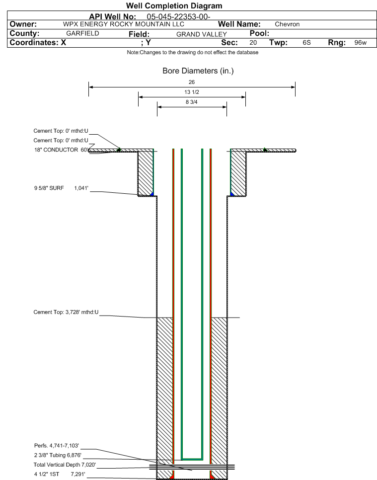 Wellbore #00 Wellbore Classification: GW Status: PR - 12/15/2014 Measured TD: 7314 ft. Vertical TD: 7020 ft.| Wellbore Data for Original Wellbore | Wellbore Classification: GW PR - 12/15/2014 | | Wellbore Permit | DIRECTIONAL | | Permit #: | | Expiration Date: | 4/6/2016 | | Proposed Top PZ Location: | Sec:21 Twp: 6S 96w | Footage: 654 FNL 691 FWL | | Bottom Hole Location: | Sec:21 Twp: 6S 96W | Footage: 654 FNL 691 FWL | | Proposed Depth/Form: | 7303 ft. | | Surface Mineral Owner Same: | No | | Mineral Owner: | FEDERAL | Surface Owner: | FEE | | Unit: | | Unit Number: | | | Formation And Spacing: | Code: WMFK , Formation: WILLIAMS FORK , Order: 510-13 , Unit Acreage: , Drill Unit: | | Casing: | String Type: CONDUCTOR, Hole Size: 26 in., Size: 18 in., Top: 0 ft., Depth: 70 ft., Weight: 48# , Citings Type: PLANNED | | Cement: | Sacks: 50, Top: 0 ft., Bottom: 70 ft. | | Casing: | String Type: SURF, Hole Size: 13.5 in., Size: 9.625 in., Top: 0 ft., Depth: 1013 ft., Weight: 32.3# , Citings Type: PLANNED | | Cement: | Sacks: 269, Top: 0 ft., Bottom: 1013 ft. | | Casing: | String Type: 1ST, Hole Size: 8.75 in., Size: 4.5 in., Top: 0 ft., Depth: 7303 ft., Weight: 11.6# , Citings Type: PLANNED | | Cement: | Sacks: 774, Top: , Bottom: 7303 ft. |