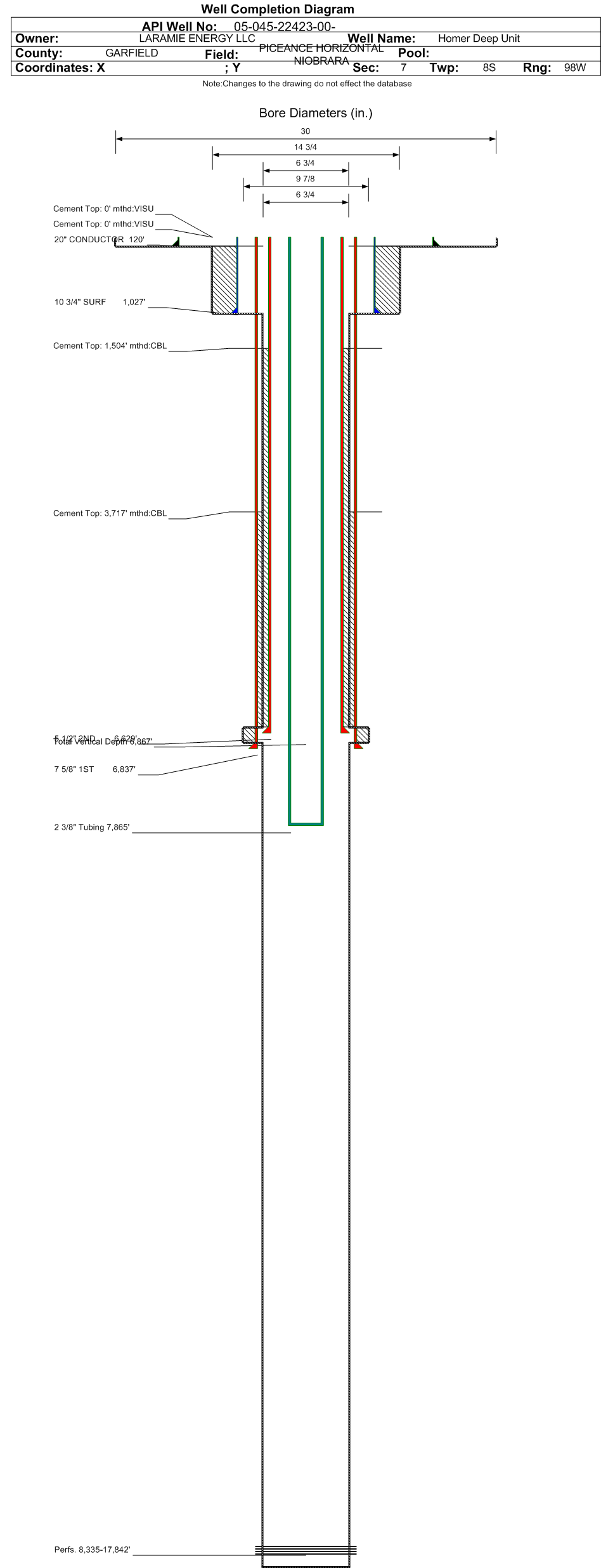 | | Tubing Size: | 2.375 in. | Tubing Setting Depth: | 7865 ft. | | Tubing Packer Depth: | | Tubing Multiple Packer: | | | Open Hole Top: | | Open Hole Bottom: | | | Initial Test Data: | | Test Date: | N/A | Test Method: | | | Hours Tested: | | Gas Type: | | | Gas Disposal: | | |