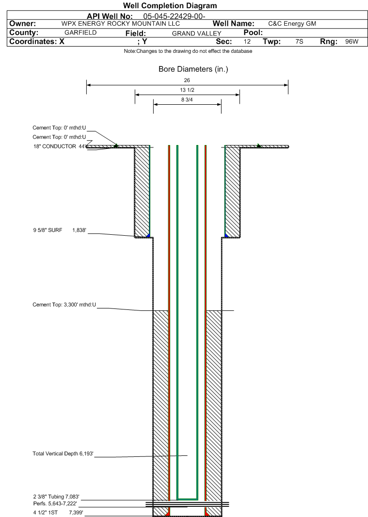 Wellbore #00 Wellbore Classification: GW Status: PR - 11/4/2014 Measured TD: 7415 ft. Vertical TD: 6193 ft.| Wellbore Data for Original Wellbore | Wellbore Classification: GW PR - 11/4/2014 | | Wellbore Permit | DIRECTIONAL | | Permit #: | | Expiration Date: | 5/30/2016 | | Proposed Top PZ Location: | Sec:12 Twp: 7S 96W | Footage: 807 FSL 1272 FEL | | Bottom Hole Location: | Sec:12 Twp: 7S 96W | Footage: 807 FSL 1272 FEL | | Proposed Depth/Form: | 7334 ft. | | Surface Mineral Owner Same: | No | | Mineral Owner: | FEE | Surface Owner: | FEE | | Unit: | | Unit Number: | | | Formation And Spacing: | Code: WFILS , Formation: WILLIAMS FORK-ILES , Order: 479-24 , Unit Acreage: 320, Drill Unit: E/2 | | Casing: | String Type: CONDUCTOR, Hole Size: 26 in., Size: 18 in., Top: 0 ft., Depth: 60 ft., Weight: 48# , Citings Type: PLANNED | | Cement: | Sacks: 50, Top: 0 ft., Bottom: 60 ft. | | Casing: | String Type: SURF, Hole Size: 13.5 in., Size: 9.625 in., Top: 0 ft., Depth: 1800 ft., Weight: 32.3# , Citings Type: PLANNED | | Cement: | Sacks: 464, Top: 0 ft., Bottom: 1800 ft. | | Casing: | String Type: 1ST, Hole Size: 8.75 in., Size: 4.5 in., Top: 0 ft., Depth: 7334 ft., Weight: 11.6# , Citings Type: PLANNED | | Cement: | Sacks: 800, Top: 3944 ft., Bottom: 7334 ft. |