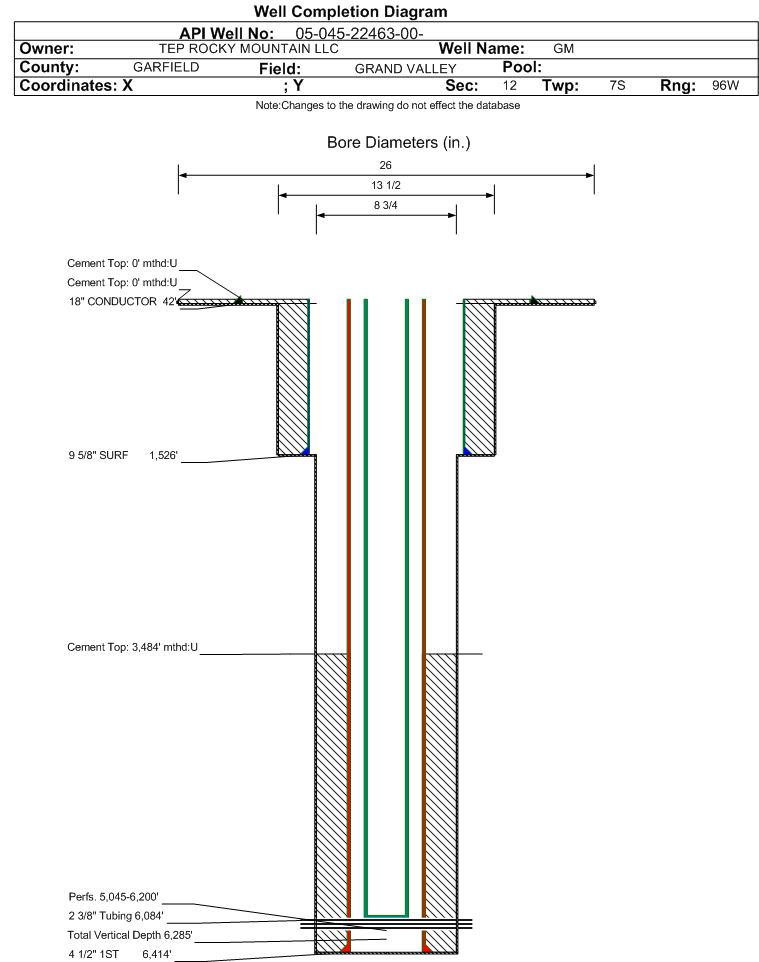 Wellbore #00 Wellbore Classification: GW Status: SI - 10/1/2025 Measured TD: 6430 ft. Vertical TD: 6285 ft.| Wellbore Data for Original Wellbore | Wellbore Classification: GW SI - 10/1/2025 | | Wellbore Permit | DIRECTIONAL | | Permit #: | | Expiration Date: | 7/28/2016 | | Proposed Top PZ Location: | Sec:12 Twp: 7S 96W | Footage: 1486 FNL 2522 FEL | | Bottom Hole Location: | Sec:12 Twp: 7S 96W | Footage: 1486 FNL 2522 FEL | | Proposed Depth/Form: | 6390 ft. | | Surface Mineral Owner Same: | Yes | | Mineral Owner: | FEE | Surface Owner: | FEE | | Unit: | | Unit Number: | | | Formation And Spacing: | Code: WMFK , Formation: WILLIAMS FORK , Order: 479-24 , Unit Acreage: 320, Drill Unit: E/2 | | Casing: | String Type: CONDUCTOR, Hole Size: 26 in., Size: 18 in., Top: 0 ft., Depth: 60 ft., Weight: 48# , Citings Type: PLANNED | | Cement: | Sacks: 30, Top: 0 ft., Bottom: 60 ft. | | Casing: | String Type: SURF, Hole Size: 13.5 in., Size: 9.625 in., Top: 0 ft., Depth: 1538 ft., Weight: 32.3# , Citings Type: PLANNED | | Cement: | Sacks: 399, Top: 0 ft., Bottom: 1538 ft. | | Casing: | String Type: 1ST, Hole Size: 8.75 in., Size: 4.5 in., Top: 0 ft., Depth: 6390 ft., Weight: 11.6# , Citings Type: PLANNED | | Cement: | Sacks: 751, Top: 3090 ft., Bottom: 6390 ft. |