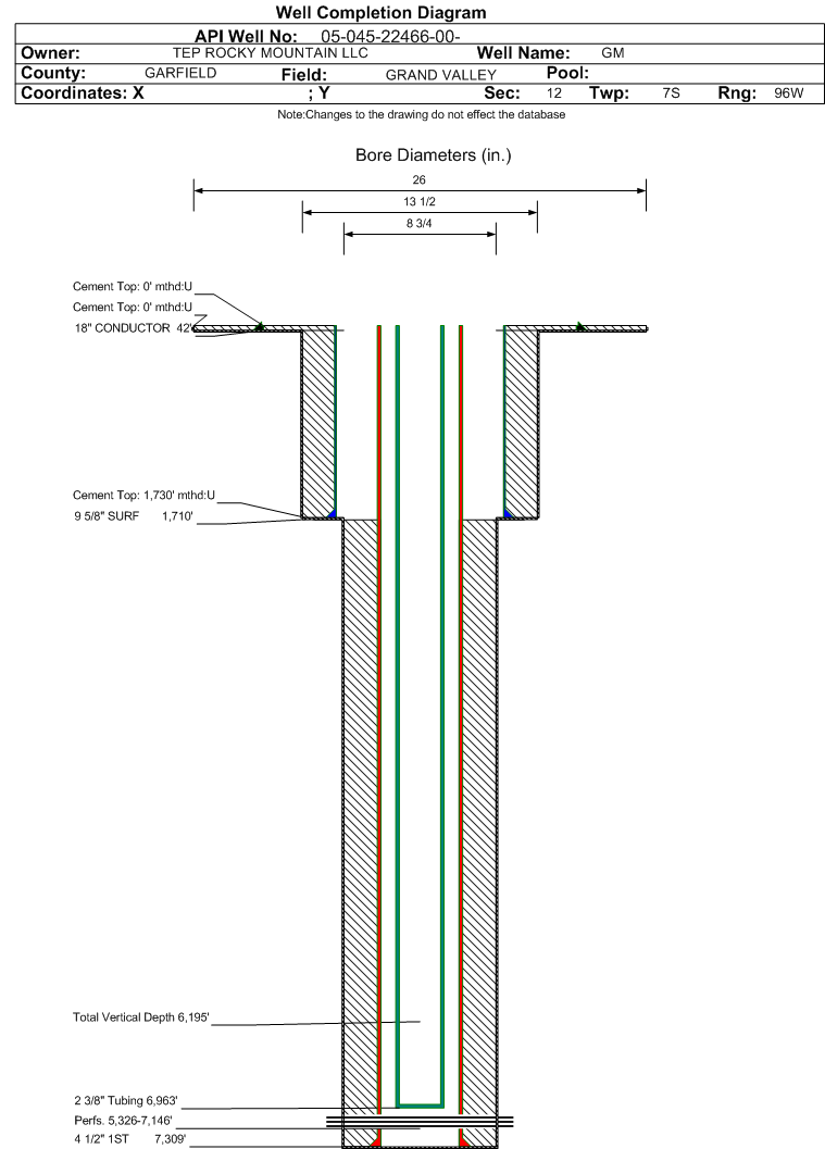 Wellbore #00 Wellbore Classification: GW Status: PR - 2/4/2015 Measured TD: 7320 ft. Vertical TD: 6195 ft.| Wellbore Data for Original Wellbore | Wellbore Classification: GW PR - 2/4/2015 | | Wellbore Permit | DIRECTIONAL | | Permit #: | | Expiration Date: | 7/28/2016 | | Proposed Top PZ Location: | Sec:12 Twp: 7S 96W | Footage: 2057 FSL 1341 FWL | | Bottom Hole Location: | Sec:12 Twp: 7S 96W | Footage: 2057 FSL 1341 FWL | | Proposed Depth/Form: | 7276 ft. | | Surface Mineral Owner Same: | Yes | | Mineral Owner: | FEE | Surface Owner: | FEE | | Unit: | | Unit Number: | | | Formation And Spacing: | Code: WMFK , Formation: WILLIAMS FORK , Order: 479-22 , Unit Acreage: 320, Drill Unit: Sec 12 E2 | | Casing: | String Type: CONDUCTOR, Hole Size: 26 in., Size: 18 in., Top: 0 ft., Depth: 60 ft., Weight: 48# , Citings Type: PLANNED | | Cement: | Sacks: 30, Top: 0 ft., Bottom: 60 ft. | | Casing: | String Type: SURF, Hole Size: 13.5 in., Size: 9.625 in., Top: 0 ft., Depth: 1527 ft., Weight: 32.3# , Citings Type: PLANNED | | Cement: | Sacks: 396, Top: 0 ft., Bottom: 1527 ft. | | Casing: | String Type: 1ST, Hole Size: 8.75 in., Size: 4.5 in., Top: 0 ft., Depth: 7276 ft., Weight: 11.6# , Citings Type: PLANNED | | Cement: | Sacks: 768, Top: 3889 ft., Bottom: 7276 ft. |