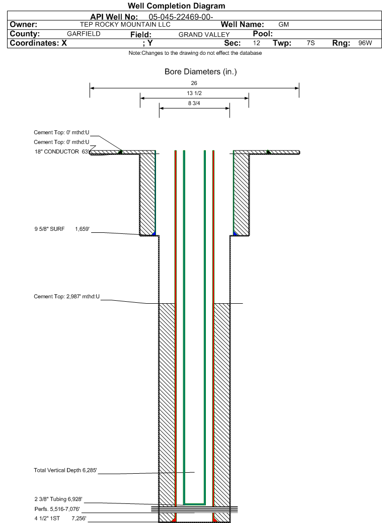 Wellbore #00 Wellbore Classification: GW Status: PR - 2/4/2015 Measured TD: 7266 ft. Vertical TD: 6285 ft.| Wellbore Data for Original Wellbore | Wellbore Classification: GW PR - 2/4/2015 | | Wellbore Permit | DIRECTIONAL | | Permit #: | | Expiration Date: | 7/28/2016 | | Proposed Top PZ Location: | Sec:12 Twp: 7S 96W | Footage: 2189 FNL 822 FEL | | Bottom Hole Location: | Sec:12 Twp: 7S 96W | Footage: 2189 FNL 822 FEL | | Proposed Depth/Form: | 7246 ft. | | Surface Mineral Owner Same: | Yes | | Mineral Owner: | FEE | Surface Owner: | FEE | | Unit: | | Unit Number: | | | Formation And Spacing: | Code: WMFK , Formation: WILLIAMS FORK , Order: 479-24 , Unit Acreage: 320, Drill Unit: E/2 | | Casing: | String Type: CONDUCTOR, Hole Size: 26 in., Size: 18 in., Top: 0 ft., Depth: 60 ft., Weight: 48# , Citings Type: PLANNED | | Cement: | Sacks: 30, Top: 0 ft., Bottom: 60 ft. | | Casing: | String Type: SURF, Hole Size: 13.5 in., Size: 9.625 in., Top: 0 ft., Depth: 1488 ft., Weight: 32.3# , Citings Type: PLANNED | | Cement: | Sacks: 387, Top: 0 ft., Bottom: 1488 ft. | | Casing: | String Type: 1ST, Hole Size: 8.75 in., Size: 4.5 in., Top: 0 ft., Depth: 7246 ft., Weight: 11.6# , Citings Type: PLANNED | | Cement: | Sacks: 760, Top: 3898 ft., Bottom: 7246 ft. |