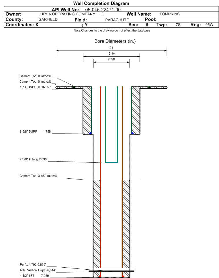 | Wellbore Completed | | Completion Date: | 7/31/2016 | | Spud Date: | 7/11/2016 | Spud Date Is: | ACTUAL | | Measured TD: | 7085 ft. | Measured PB depth: | 7026 ft. | | True Vertical TD: | 6844 ft. | True Vertical PB depth: | 6785 ft. | | Top PZ Location: | Sec:8 Twp: 7S 95W | Footage: 136 FNL 1940 FEL | | Bottom Hole Location: | Sec:8 Twp: 7S 95W | Footage: 183 FNL 1950 FEL | | Log Types: | CBL/MUD/PULSED NEUTRON/Triple Combo in 045-22480 | | Casing: | String Type: CONDUCTOR, Hole Size: 24 in., Size: 16 in., Top: 0 ft., Depth: 60 ft., Weight: 75 , Citings Type: ACTUAL | | Cement: | Sacks: 70, Top: 0 ft., Bottom: 60 ft., Determination Method: VISU | | Casing: | String Type: SURF, Hole Size: 12.25 in., Size: 8.625 in., Top: 0 ft., Depth: 1758 ft., Weight: 32 , Citings Type: ACTUAL | | Cement: | Sacks: 502, Top: 0 ft., Bottom: 1758 ft., Determination Method: VISU | | Casing: | String Type: 1ST, Hole Size: 7.875 in., Size: 4.5 in., Top: 0 ft., Depth: 7069 ft., Weight: 11.6 , Citings Type: ACTUAL | | Cement: | Sacks: 798, Top: 3457 ft., Bottom: 7069 ft., Determination Method: CBL | | Formation | Interval Top | Log Bottom | Cored | DSTs | | WASATCH | 2246 ft. | | N | N | | OHIO CREEK | 3705 ft. | | N | N | | WILLIAMS FORK | 3855 ft. | | N | N | | CAMEO | 6429 ft. | | N | N | | ROLLINS | 6945 ft. | | N | N |