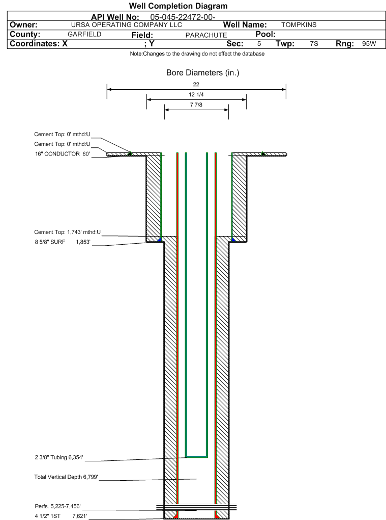 | Wellbore Completed | | Completion Date: | 8/27/2016 | | Spud Date: | 8/8/2016 | Spud Date Is: | ACTUAL | | Measured TD: | 7640 ft. | Measured PB depth: | 7577 ft. | | True Vertical TD: | 6799 ft. | True Vertical PB depth: | 6736 ft. | | Top PZ Location: | Sec:8 Twp: 7S 95W | Footage: 1991 FNL 1920 FEL | | Bottom Hole Location: | Sec:8 Twp: 7S 95W | Footage: 2086 FNL 2023 FEL | | Log Types: | CBL/MUD/PULSED NEUTRON/Triple Combo in 045-22480 | | Casing: | String Type: CONDUCTOR, Hole Size: 22 in., Size: 16 in., Top: 0 ft., Depth: 60 ft., Weight: 75 , Citings Type: ACTUAL | | Cement: | Sacks: 70, Top: 0 ft., Bottom: 60 ft., Determination Method: VISU | | Casing: | String Type: SURF, Hole Size: 12.25 in., Size: 8.625 in., Top: 0 ft., Depth: 1853 ft., Weight: 32 , Citings Type: ACTUAL | | Cement: | Sacks: 410, Top: 0 ft., Bottom: 1853 ft., Determination Method: VISU | | Casing: | String Type: 1ST, Hole Size: 7.875 in., Size: 4.5 in., Top: 0 ft., Depth: 7621 ft., Weight: 11.6 , Citings Type: ACTUAL | | Cement: | Sacks: 842, Top: 1743 ft., Bottom: 7621 ft., Determination Method: CBL | | Formation | Interval Top | Log Bottom | Cored | DSTs | | WASATCH | 2647 ft. | | N | N | | OHIO CREEK | 4106 ft. | | N | N | | WILLIAMS FORK | 4256 ft. | | N | N | | CAMEO | 6974 ft. | | N | N | | ROLLINS | 7460 ft. | | N | N |