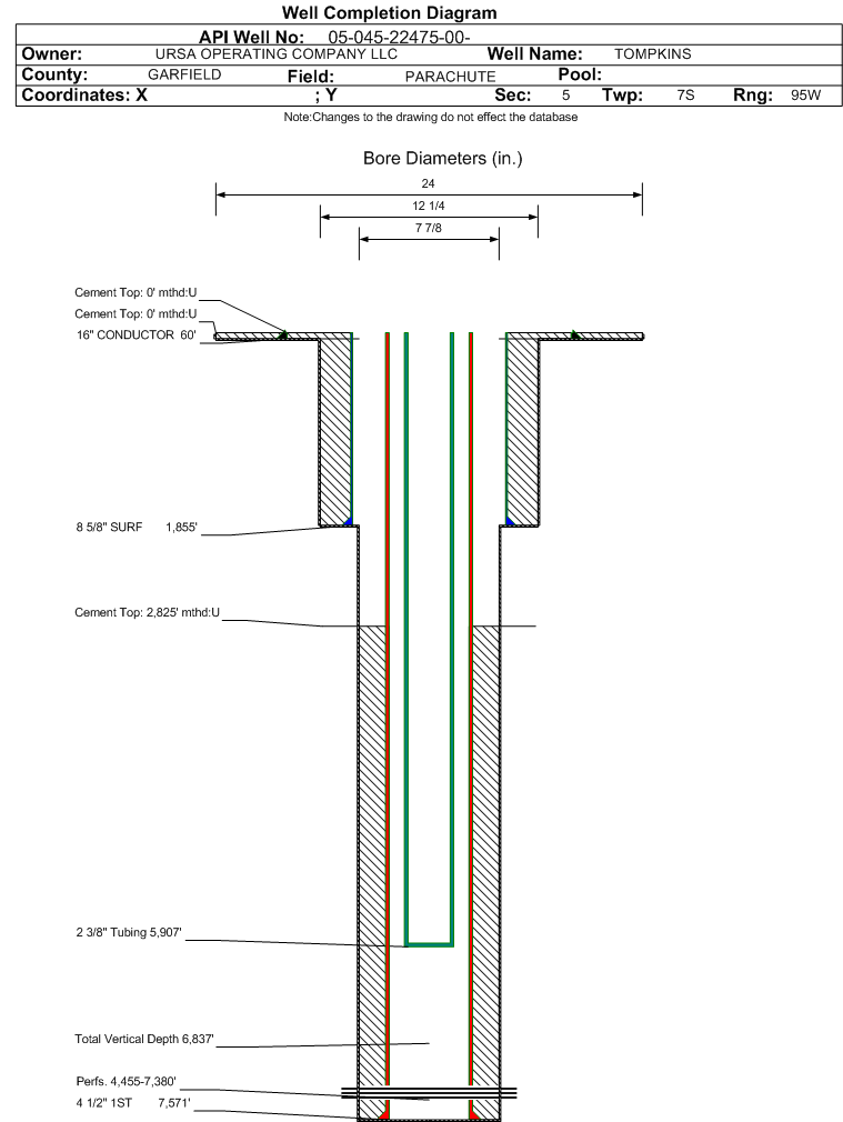| Wellbore Completed | | Completion Date: | 8/31/2016 | | Spud Date: | 8/7/2016 | Spud Date Is: | ACTUAL | | Measured TD: | 7590 ft. | Measured PB depth: | 7527 ft. | | True Vertical TD: | 6837 ft. | True Vertical PB depth: | 6774 ft. | | Top PZ Location: | Sec:8 Twp: 7S 95W | Footage: 1586 FNL 1792 FEL | | Bottom Hole Location: | Sec:8 Twp: 7S 95W | Footage: 1817 FNL 1970 FEL | | Log Types: | CBL/MUD/PULSED NEUTRON/Triple Combo in 045-22480 | | Casing: | String Type: CONDUCTOR, Hole Size: 24 in., Size: 16 in., Top: 0 ft., Depth: 60 ft., Weight: 75 , Citings Type: ACTUAL | | Cement: | Sacks: 70, Top: 0 ft., Bottom: 60 ft., Determination Method: VISU | | Casing: | String Type: SURF, Hole Size: 12.25 in., Size: 8.625 in., Top: 0 ft., Depth: 1855 ft., Weight: 32 , Citings Type: ACTUAL | | Cement: | Sacks: 405, Top: 0 ft., Bottom: 1855 ft., Determination Method: VISU | | Casing: | String Type: 1ST, Hole Size: 7.875 in., Size: 4.5 in., Top: 0 ft., Depth: 7571 ft., Weight: 11.6 , Citings Type: ACTUAL | | Cement: | Sacks: 829, Top: 2825 ft., Bottom: 7571 ft., Determination Method: CBL | | Formation | Interval Top | Log Bottom | Cored | DSTs | | WASATCH | 2603 ft. | | N | N | | OHIO CREEK | 4062 ft. | | N | N | | WILLIAMS FORK | 4212 ft. | | N | N | | CAMEO | 6897 ft. | | N | N | | ROLLINS | 7388 ft. | | N | N |