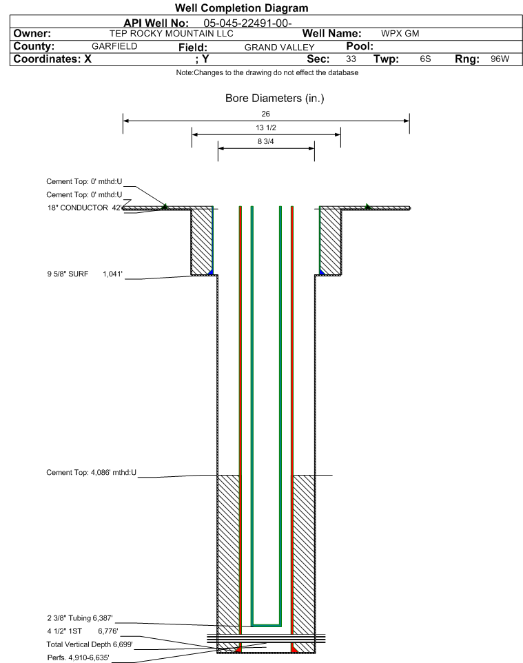 Wellbore #00 Wellbore Classification: GW Status: PR - 12/31/2014 Measured TD: 6800 ft. Vertical TD: 6699 ft.| Wellbore Data for Original Wellbore | Wellbore Classification: GW PR - 12/31/2014 | | Wellbore Permit | DIRECTIONAL | | Permit #: | | Expiration Date: | 8/9/2016 | | Proposed Top PZ Location: | Sec:33 Twp: 6S 96W | Footage: 1476 FSL 1565 FWL | | Bottom Hole Location: | Sec:33 Twp: 6S 96W | Footage: 1476 FSL 1565 FWL | | Proposed Depth/Form: | 6795 ft. | | Surface Mineral Owner Same: | No | | Mineral Owner: | FEDERAL | Surface Owner: | FEE | | Unit: | | Unit Number: | | | Formation And Spacing: | Code: WMFK , Formation: WILLIAMS FORK , Order: 479-17 , Unit Acreage: 80, Drill Unit: N2SW | | Casing: | String Type: CONDUCTOR, Hole Size: 26 in., Size: 18 in., Top: 0 ft., Depth: 60 ft., Weight: 48# , Citings Type: PLANNED | | Cement: | Sacks: 25, Top: 0 ft., Bottom: 60 ft. | | Casing: | String Type: SURF, Hole Size: 13.5 in., Size: 9.625 in., Top: 0 ft., Depth: 1012 ft., Weight: 32.3# , Citings Type: PLANNED | | Cement: | Sacks: 269, Top: 0 ft., Bottom: 1012 ft. | | Casing: | String Type: 1ST, Hole Size: 8.75 in., Size: 4.5 in., Top: 0 ft., Depth: 6795 ft., Weight: 11.6# , Citings Type: PLANNED | | Cement: | Sacks: 754, Top: , Bottom: 6795 ft. |