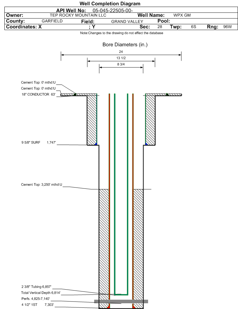 Wellbore #00 Wellbore Classification: GW Status: PR - 5/31/2015 Measured TD: 7317 ft. Vertical TD: 6814 ft.| Wellbore Data for Original Wellbore | Wellbore Classification: GW PR - 5/31/2015 | | Wellbore Permit | DIRECTIONAL | | Permit #: | | Expiration Date: | 8/15/2016 | | Proposed Top PZ Location: | Sec:28 Twp: 6S 96W | Footage: 2279 FNL 1690 FEL | | Bottom Hole Location: | Sec:28 Twp: 6S 96W | Footage: 2279 FNL 1690 FEL | | Proposed Depth/Form: | 7323 ft. | | Surface Mineral Owner Same: | No | | Mineral Owner: | FEDERAL | Surface Owner: | FEE | | Unit: | | Unit Number: | | | Formation And Spacing: | Code: WMFK , Formation: WILLIAMS FORK , Order: 479-17 , Unit Acreage: , Drill Unit: | | Casing: | String Type: CONDUCTOR, Hole Size: 26 in., Size: 18 in., Top: 0 ft., Depth: 60 ft., Weight: 48# , Citings Type: PLANNED | | Cement: | Sacks: 25, Top: 0 ft., Bottom: 60 ft. | | Casing: | String Type: SURF, Hole Size: 13.5 in., Size: 9.625 in., Top: 0 ft., Depth: 1740 ft., Weight: 32.3# , Citings Type: PLANNED | | Cement: | Sacks: 449, Top: 0 ft., Bottom: 1740 ft. | | Casing: | String Type: 1ST, Hole Size: 8.75 in., Size: 4.5 in., Top: 0 ft., Depth: 7323 ft., Weight: 11.6# , Citings Type: PLANNED | | Cement: | Sacks: 773, Top: , Bottom: 7323 ft. |