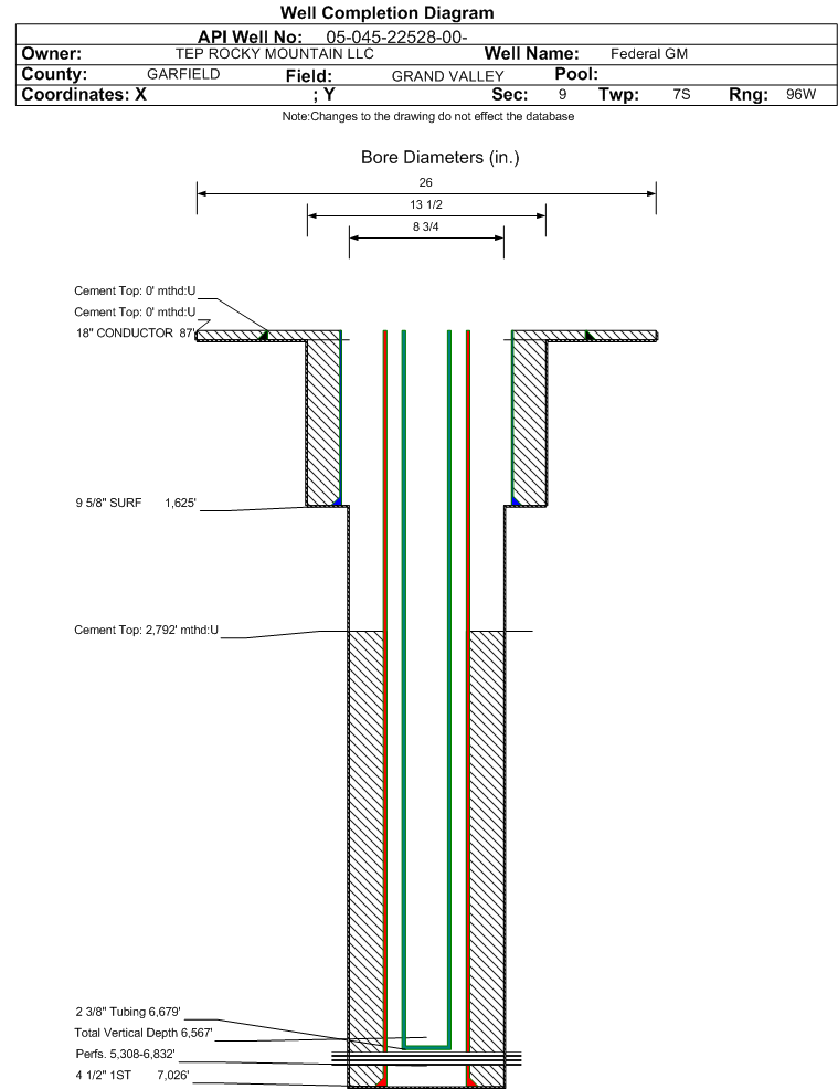 | Wellbore Completed | | Completion Date: | 7/19/2016 | | Spud Date: | 7/15/2016 | Spud Date Is: | ACTUAL | | Measured TD: | 7035 ft. | Measured PB depth: | 7001 ft. | | True Vertical TD: | 6567 ft. | True Vertical PB depth: | 6533 ft. | | Top PZ Location: | Sec:9 Twp: 7S 96W | Footage: 1986 FNL 1899 FWL | | Bottom Hole Location: | Sec:9 Twp: 7S 96W | Footage: 1994 FNL 1906 FWL | | Log Types: | CBL/MUD/RPM/Triple Combo on 045-22531 | | Casing: | String Type: CONDUCTOR, Hole Size: 26 in., Size: 18 in., Top: 0 ft., Depth: 87 ft., Weight: 47.4 , Citings Type: ACTUAL | | Cement: | Sacks: 33, Top: 0 ft., Bottom: 87 ft., Determination Method: VISU | | Casing: | String Type: SURF, Hole Size: 13.5 in., Size: 9.625 in., Top: 0 ft., Depth: 1625 ft., Weight: 32.3 , Citings Type: ACTUAL | | Cement: | Sacks: 415, Top: 0 ft., Bottom: 1625 ft., Determination Method: VISU | | Casing: | String Type: 1ST, Hole Size: 8.75 in., Size: 4.5 in., Top: 0 ft., Depth: 7026 ft., Weight: 11.6 , Citings Type: ACTUAL | | Cement: | Sacks: 830, Top: 2792 ft., Bottom: 7026 ft., Determination Method: CBL | | Formation | Interval Top | Log Bottom | Cored | DSTs | | WASATCH G | 2294 ft. | | | | | OHIO CREEK | 3961 ft. | | | | | MESAVERDE | 4034 ft. | | | | | WILLIAMS FORK | 4034 ft. | | | | | CAMEO | 6482 ft. | | | | | ROLLINS | 6922 ft. | | | |