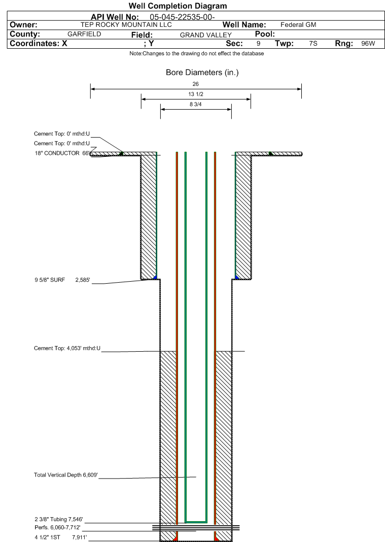 | Wellbore Completed | | Completion Date: | 7/4/2016 | | Spud Date: | 6/28/2016 | Spud Date Is: | ACTUAL | | Measured TD: | 7921 ft. | Measured PB depth: | 7882 ft. | | True Vertical TD: | 6609 ft. | True Vertical PB depth: | 6570 ft. | | Top PZ Location: | Sec:9 Twp: 7S 96W | Footage: 1921 FNL 1566 FEL | | Bottom Hole Location: | Sec:9 Twp: 7S 96W | Footage: 1952 FNL 1506 FEL | | Log Types: | CBL/MUD/RPM/Triple Combo on 045-22531 | | Casing: | String Type: CONDUCTOR, Hole Size: 26 in., Size: 18 in., Top: 0 ft., Depth: 66 ft., Weight: 47.4 , Citings Type: ACTUAL | | Cement: | Sacks: 25, Top: 0 ft., Bottom: 66 ft., Determination Method: VISU | | Casing: | String Type: SURF, Hole Size: 13.5 in., Size: 9.625 in., Top: 0 ft., Depth: 2585 ft., Weight: 32.3 , Citings Type: ACTUAL | | Cement: | Sacks: 695, Top: 0 ft., Bottom: 2585 ft., Determination Method: VISU | | Casing: | String Type: 1ST, Hole Size: 8.75 in., Size: 4.5 in., Top: 0 ft., Depth: 7911 ft., Weight: 11.6 , Citings Type: ACTUAL | | Cement: | Sacks: 865, Top: 4053 ft., Bottom: 7911 ft., Determination Method: CBL | | Formation | Interval Top | Log Bottom | Cored | DSTs | | WASATCH G | 2058 ft. | | | | | OHIO CREEK | 4598 ft. | | | | | MESAVERDE | 4766 ft. | | | | | WILLIAMS FORK | 4766 ft. | | | | | CAMEO | 7386 ft. | | | | | ROLLINS | 7793 ft. | | | |