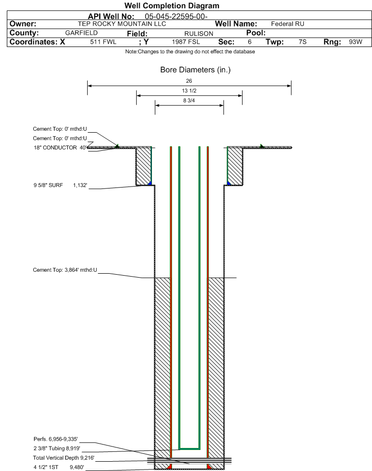 | Wellbore Completed | | Completion Date: | 5/21/2016 | | Spud Date: | 5/16/2016 | Spud Date Is: | ACTUAL | | Measured TD: | 9490 ft. | Measured PB depth: | 9406 ft. | | True Vertical TD: | 9216 ft. | True Vertical PB depth: | 9132 ft. | | Top PZ Location: | Sec:6 Twp: 7S 93W | Footage: 1349 FNL 1367 FWL | | Bottom Hole Location: | Sec:6 Twp: 7S 93W | Footage: 1392 FNL 1329 FWL | | Log Types: | CBL/MUD/RPM/Triple combo on 045-22602 | | Casing: | String Type: CONDUCTOR, Hole Size: 26 in., Size: 18 in., Top: 0 ft., Depth: 40 ft., Weight: 47.4 , Citings Type: ACTUAL | | Cement: | Sacks: 15, Top: 0 ft., Bottom: 40 ft., Determination Method: VISU | | Casing: | String Type: SURF, Hole Size: 13.5 in., Size: 9.625 in., Top: 0 ft., Depth: 1132 ft., Weight: 32.3 , Citings Type: ACTUAL | | Cement: | Sacks: 315, Top: 0 ft., Bottom: 1132 ft., Determination Method: VISU | | Casing: | String Type: 1ST, Hole Size: 8.75 in., Size: 4.5 in., Top: 0 ft., Depth: 9480 ft., Weight: 11.6 , Citings Type: ACTUAL | | Cement: | Sacks: 1100, Top: 3864 ft., Bottom: 9480 ft., Determination Method: CBL | | Formation | Interval Top | Log Bottom | Cored | DSTs | | WASATCH G | 2946 ft. | | | | | OHIO CREEK | 5541 ft. | | | | | MESAVERDE | 5665 ft. | | | | | WILLIAMS FORK | 5665 ft. | | | | | CAMEO | 8510 ft. | | | | | ROLLINS | 9346 ft. | | | |
