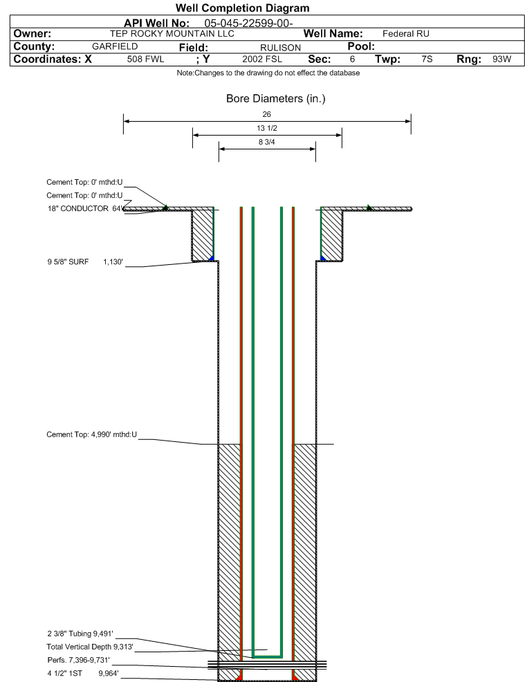 | Wellbore Completed | | Completion Date: | 4/27/2016 | | Spud Date: | 4/20/2016 | Spud Date Is: | ACTUAL | | Measured TD: | 9970 ft. | Measured PB depth: | 9840 ft. | | True Vertical TD: | 9313 ft. | True Vertical PB depth: | 9183 ft. | | Top PZ Location: | Sec:6 Twp: 7S 93W | Footage: 234 FNL 1555 FWL | | Bottom Hole Location: | Sec:6 Twp: 7S 93W | Footage: 246 FNL 1544 FWL | | Log Types: | CBL/MUD/RPM/Triple combo on 045-22602 | | Casing: | String Type: CONDUCTOR, Hole Size: 26 in., Size: 18 in., Top: 0 ft., Depth: 64 ft., Weight: 47.4 , Citings Type: ACTUAL | | Cement: | Sacks: 24, Top: 0 ft., Bottom: 64 ft., Determination Method: VISU | | Casing: | String Type: SURF, Hole Size: 13.5 in., Size: 9.625 in., Top: 0 ft., Depth: 1130 ft., Weight: 32.3 , Citings Type: ACTUAL | | Cement: | Sacks: 315, Top: 0 ft., Bottom: 1130 ft., Determination Method: VISU | | Casing: | String Type: 1ST, Hole Size: 8.75 in., Size: 4.5 in., Top: 0 ft., Depth: 9964 ft., Weight: 11.6 , Citings Type: ACTUAL | | Cement: | Sacks: 1105, Top: 4990 ft., Bottom: 9964 ft., Determination Method: CBL | | Formation | Interval Top | Log Bottom | Cored | DSTs | | WASATCH G | 3226 ft. | | | | | OHIO CREEK | 5943 ft. | | | | | MESAVERDE | 6051 ft. | | | | | WILLIAMS FORK | 6051 ft. | | | | | CAMEO | 8944 ft. | | | | | ROLLINS | 9803 ft. | | | |