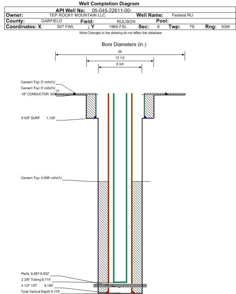 | Wellbore Completed | | Completion Date: | 4/12/2016 | | Spud Date: | 4/7/2016 | Spud Date Is: | ACTUAL | | Measured TD: | 9197 ft. | Measured PB depth: | 9106 ft. | | True Vertical TD: | 9179 ft. | True Vertical PB depth: | 9088 ft. | | Top PZ Location: | Sec:6 Twp: 7S 93W | Footage: 2235 FSL 556 FWL | | Bottom Hole Location: | Sec:6 Twp: 7S 93W | Footage: 2228 FSL 510 FWL | | Log Types: | MUD/RPM/CBL/Triple combo on 045-22602 | | Casing: | String Type: CONDUCTOR, Hole Size: 26 in., Size: 18 in., Top: 0 ft., Depth: 60 ft., Weight: 47.4 , Citings Type: ACTUAL | | Cement: | Sacks: 22, Top: 0 ft., Bottom: 60 ft., Determination Method: VISU | | Casing: | String Type: SURF, Hole Size: 13.5 in., Size: 9.625 in., Top: 0 ft., Depth: 1135 ft., Weight: 32.3 , Citings Type: ACTUAL | | Cement: | Sacks: 305, Top: 0 ft., Bottom: 1135 ft., Determination Method: VISU | | Casing: | String Type: 1ST, Hole Size: 8.75 in., Size: 4.5 in., Top: 0 ft., Depth: 9190 ft., Weight: 11.6 , Citings Type: ACTUAL | | Cement: | Sacks: 1075, Top: 4058 ft., Bottom: 9190 ft., Determination Method: CBL | | Formation | Interval Top | Log Bottom | Cored | DSTs | | WASATCH G | 2887 ft. | | | | | OHIO CREEK | 5264 ft. | | | | | MESAVERDE | 5398 ft. | | | | | WILLIAMS FORK | 5398 ft. | | | | | CAMEO | 8184 ft. | | | | | ROLLINS | 9019 ft. | | | |