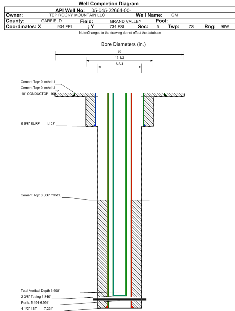 | Wellbore Completed | | Completion Date: | 9/13/2017 | | Spud Date: | 9/10/2017 | Spud Date Is: | ACTUAL | | Measured TD: | 7234 ft. | Measured PB depth: | 7195 ft. | | True Vertical TD: | 6698 ft. | True Vertical PB depth: | 6659 ft. | | Top PZ Location: | Sec:5 Twp: 7S 96W | Footage: 2516 FSL 941 FEL | | Bottom Hole Location: | Sec:5 Twp: 7S 96W | Footage: 2477 FSL 968 FEL | | Log Types: | CBL/PULSED NEUTRON/(TRIPLE COMBO IN 045-22668) | | Casing: | String Type: CONDUCTOR, Hole Size: 26 in., Size: 18 in., Top: 0 ft., Depth: 109 ft., Weight: 47.44 , Citings Type: ACTUAL | | Cement: | Sacks: 182, Top: 0 ft., Bottom: 109 ft., Determination Method: VISU | | Casing: | String Type: SURF, Hole Size: 13.5 in., Size: 9.625 in., Top: 0 ft., Depth: 1123 ft., Weight: 32.3 , Citings Type: ACTUAL | | Cement: | Sacks: 300, Top: 0 ft., Bottom: 1123 ft., Determination Method: VISU | | Casing: | String Type: 1ST, Hole Size: 8.75 in., Size: 4.5 in., Top: 0 ft., Depth: 7234 ft., Weight: 11.6 , Citings Type: ACTUAL | | Cement: | Sacks: 860, Top: 3606 ft., Bottom: 7234 ft., Determination Method: CBL | | Formation | Interval Top | Log Bottom | Cored | DSTs | | WASATCH G | 2461 ft. | | | | | MESAVERDE | 4122 ft. | | | | | OHIO CREEK | 4122 ft. | | | | | WILLIAMS FORK | 4291 ft. | | | | | CAMEO | 6676 ft. | | | | | ROLLINS | 7074 ft. | | | |