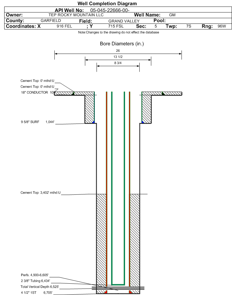 | Wellbore Completed | | Completion Date: | 9/26/2017 | | Spud Date: | 9/21/2017 | Spud Date Is: | ACTUAL | | Measured TD: | 6705 ft. | Measured PB depth: | 6657 ft. | | True Vertical TD: | 6525 ft. | True Vertical PB depth: | 6477 ft. | | Top PZ Location: | Sec:5 Twp: 7S 96W | Footage: 1732 FSL 975 FEL | | Bottom Hole Location: | Sec:5 Twp: 7S 96W | Footage: 1732 FSL 975 FEL | | Log Types: | CBL/PULSED NEUTRON LOG/TRIPLE COMBO IN 045-22666 | | Casing: | String Type: CONDUCTOR, Hole Size: 26 in., Size: 18 in., Top: 0 ft., Depth: 109 ft., Weight: 47.44 , Citings Type: ACTUAL | | Cement: | Sacks: 182, Top: 0 ft., Bottom: 109 ft., Determination Method: VISU | | Casing: | String Type: SURF, Hole Size: 13.5 in., Size: 9.625 in., Top: 0 ft., Depth: 1044 ft., Weight: 32.3 , Citings Type: ACTUAL | | Cement: | Sacks: 275, Top: 0 ft., Bottom: 1044 ft., Determination Method: VISU | | Casing: | String Type: 1ST, Hole Size: 8.75 in., Size: 4.5 in., Top: 0 ft., Depth: 6705 ft., Weight: 11.6 , Citings Type: ACTUAL | | Cement: | Sacks: 835, Top: 3402 ft., Bottom: 6705 ft., Determination Method: CBL | | Formation | Interval Top | Log Bottom | Cored | DSTs | | WASATCH G | 2193 ft. | | | | | MESAVERDE | 3702 ft. | | | | | OHIO CREEK | 3702 ft. | | | | | WILLIAMS FORK | 3944 ft. | | | | | CAMEO | 4872 ft. | | | | | ROLLINS | 6682 ft. | | | |
