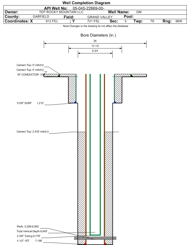 | Wellbore Completed | | Completion Date: | 9/21/2017 | | Spud Date: | 9/17/2017 | Spud Date Is: | ACTUAL | | Measured TD: | 7163 ft. | Measured PB depth: | 7122 ft. | | True Vertical TD: | 6645 ft. | True Vertical PB depth: | 6604 ft. | | Top PZ Location: | Sec:5 Twp: 7S 96W | Footage: 2137 FSL 2314 FEL | | Bottom Hole Location: | Sec:5 Twp: 7S 96W | Footage: 2099 FSL 2370 FEL | | Log Types: | CBL/PULSED NEUTRON LOG/TRIPLE COMBO IN 045-22668 | | Casing: | String Type: CONDUCTOR, Hole Size: 26 in., Size: 18 in., Top: 0 ft., Depth: 109 ft., Weight: 47.44 , Citings Type: ACTUAL | | Cement: | Sacks: 182, Top: 0 ft., Bottom: 109 ft., Determination Method: VISU | | Casing: | String Type: SURF, Hole Size: 13.5 in., Size: 9.625 in., Top: 0 ft., Depth: 1212 ft., Weight: 32.3 , Citings Type: ACTUAL | | Cement: | Sacks: 320, Top: 0 ft., Bottom: 1212 ft., Determination Method: VISU | | Casing: | String Type: 1ST, Hole Size: 8.75 in., Size: 4.5 in., Top: 0 ft., Depth: 7158 ft., Weight: 11.6 , Citings Type: ACTUAL | | Cement: | Sacks: 865, Top: 2433 ft., Bottom: 7158 ft., Determination Method: CBL | | Formation | Interval Top | Log Bottom | Cored | DSTs | | WASATCH G | 2327 ft. | | | | | MESAVERDE | 4043 ft. | | | | | OHIO CREEK | 4043 ft. | | | | | WILLIAMS FORK | 4252 ft. | | | | | CAMEO | 6675 ft. | | | | | ROLLINS | 7035 ft. | | | |