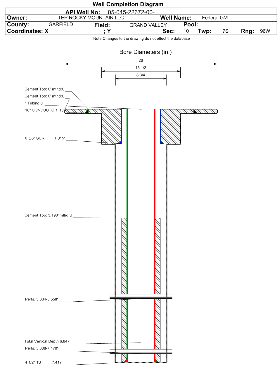 | Wellbore Completed | | Completion Date: | 7/22/2017 | | Spud Date: | 7/18/2017 | Spud Date Is: | ACTUAL | | Measured TD: | 7417 ft. | Measured PB depth: | 7381 ft. | | True Vertical TD: | 6847 ft. | True Vertical PB depth: | 6811 ft. | | Top PZ Location: | Sec:10 Twp: 7S 96W | Footage: 498 FNL 335 FWL | | Bottom Hole Location: | Sec:10 Twp: 7S 96W | Footage: 558 FNL 309 FWL | | Log Types: | CBL/PULSED NEUTRON(TRIPLE COMBO IN 045-22704) | | Casing: | String Type: CONDUCTOR, Hole Size: 26 in., Size: 18 in., Top: 0 ft., Depth: 108 ft., Weight: 47.44 , Citings Type: ACTUAL | | Cement: | Sacks: 180, Top: 0 ft., Bottom: 108 ft., Determination Method: VISU | | Casing: | String Type: SURF, Hole Size: 13.5 in., Size: 6.625 in., Top: 0 ft., Depth: 1015 ft., Weight: 32.3 , Citings Type: ACTUAL | | Cement: | Sacks: 275, Top: 0 ft., Bottom: 1015 ft., Determination Method: VISU | | Casing: | String Type: 1ST, Hole Size: 8.75 in., Size: 4.5 in., Top: 0 ft., Depth: 7417 ft., Weight: 11.6 , Citings Type: ACTUAL | | Cement: | Sacks: 895, Top: 3190 ft., Bottom: 7417 ft., Determination Method: CBL | | Formation | Interval Top | Log Bottom | Cored | DSTs | | WASATCH G | 2273 ft. | | | | | MESAVERDE | 4261 ft. | | | | | OHIO CREEK | 4261 ft. | | | | | WILLIAMS FORK | 4397 ft. | | | | | CAMEO | 6872 ft. | | | | | ROLLINS | 7245 ft. | | | |
