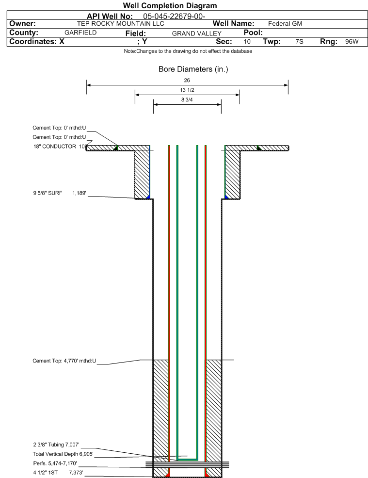 | Wellbore Completed | | Completion Date: | 8/9/2017 | | Spud Date: | 8/5/2017 | Spud Date Is: | ACTUAL | | Measured TD: | 7373 ft. | Measured PB depth: | 7331 ft. | | True Vertical TD: | 6905 ft. | True Vertical PB depth: | 6863 ft. | | Top PZ Location: | Sec:10 Twp: 7S 96W | Footage: 156 FNL 2260 FWL | | Bottom Hole Location: | Sec:10 Twp: 7S 96W | Footage: 194 FNL 2218 FWL | | Log Types: | CBL/PULSED NEUTRON LOG/TRIPLE COMBO IN 045-22704 | | Casing: | String Type: CONDUCTOR, Hole Size: 26 in., Size: 18 in., Top: 0 ft., Depth: 108 ft., Weight: 47.44 , Citings Type: ACTUAL | | Cement: | Sacks: 180, Top: 0 ft., Bottom: 108 ft., Determination Method: VISU | | Casing: | String Type: SURF, Hole Size: 13.5 in., Size: 9.625 in., Top: 0 ft., Depth: 1189 ft., Weight: 32.3 , Citings Type: ACTUAL | | Cement: | Sacks: 315, Top: 0 ft., Bottom: 1189 ft., Determination Method: VISU | | Casing: | String Type: 1ST, Hole Size: 8.75 in., Size: 4.5 in., Top: 0 ft., Depth: 7373 ft., Weight: 11.6 , Citings Type: ACTUAL | | Cement: | Sacks: 830, Top: 4770 ft., Bottom: 7373 ft., Determination Method: CBL | | Formation | Interval Top | Log Bottom | Cored | DSTs | | WASATCH G | 2247 ft. | | | | | MESAVERDE | 4230 ft. | | | | | OHIO CREEK | 4230 ft. | | | | | WILLIAMS FORK | 4309 ft. | | | | | CAMEO | 6918 ft. | | | | | ROLLINS | 7237 ft. | | | |