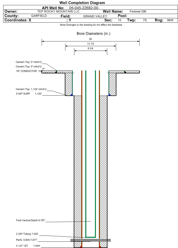 | Wellbore Completed | | Completion Date: | 5/30/2017 | | Spud Date: | 5/26/2017 | Spud Date Is: | ACTUAL | | Measured TD: | 7950 ft. | Measured PB depth: | 7914 ft. | | True Vertical TD: | 6767 ft. | True Vertical PB depth: | 6731 ft. | | Top PZ Location: | Sec:9 Twp: 7S 96W | Footage: 1583 FNL 1526 FEL | | Bottom Hole Location: | Sec:9 Twp: 7S 96W | Footage: 1590 FNL 1526 FEL | | Log Types: | MUD/CBL/PULSED NEUTRON/TRIPLE COMBO IN 045-22704 | | Casing: | String Type: CONDUCTOR, Hole Size: 26 in., Size: 18 in., Top: 0 ft., Depth: 108 ft., Weight: 47.44 , Citings Type: ACTUAL | | Cement: | Sacks: 180, Top: 0 ft., Bottom: 108 ft., Determination Method: VISU | | Casing: | String Type: SURF, Hole Size: 13.5 in., Size: 9.625 in., Top: 0 ft., Depth: 1120 ft., Weight: 32.3 , Citings Type: ACTUAL | | Cement: | Sacks: 305, Top: 0 ft., Bottom: 1120 ft., Determination Method: VISU | | Casing: | String Type: 1ST, Hole Size: 8.75 in., Size: 4.5 in., Top: 0 ft., Depth: 7944 ft., Weight: 11.6 , Citings Type: ACTUAL | | Cement: | Sacks: 765, Top: 1132 ft., Bottom: 7944 ft., Determination Method: CBL | | Formation | Interval Top | Log Bottom | Cored | DSTs | | WASATCH G | 2757 ft. | | | | | MESAVERDE | 4734 ft. | | | | | OHIO CREEK | 4734 ft. | | | | | WILLIAMS FORK | 4858 ft. | | | | | CAMEO | 7389 ft. | | | | | ROLLINS | 7753 ft. | | | |