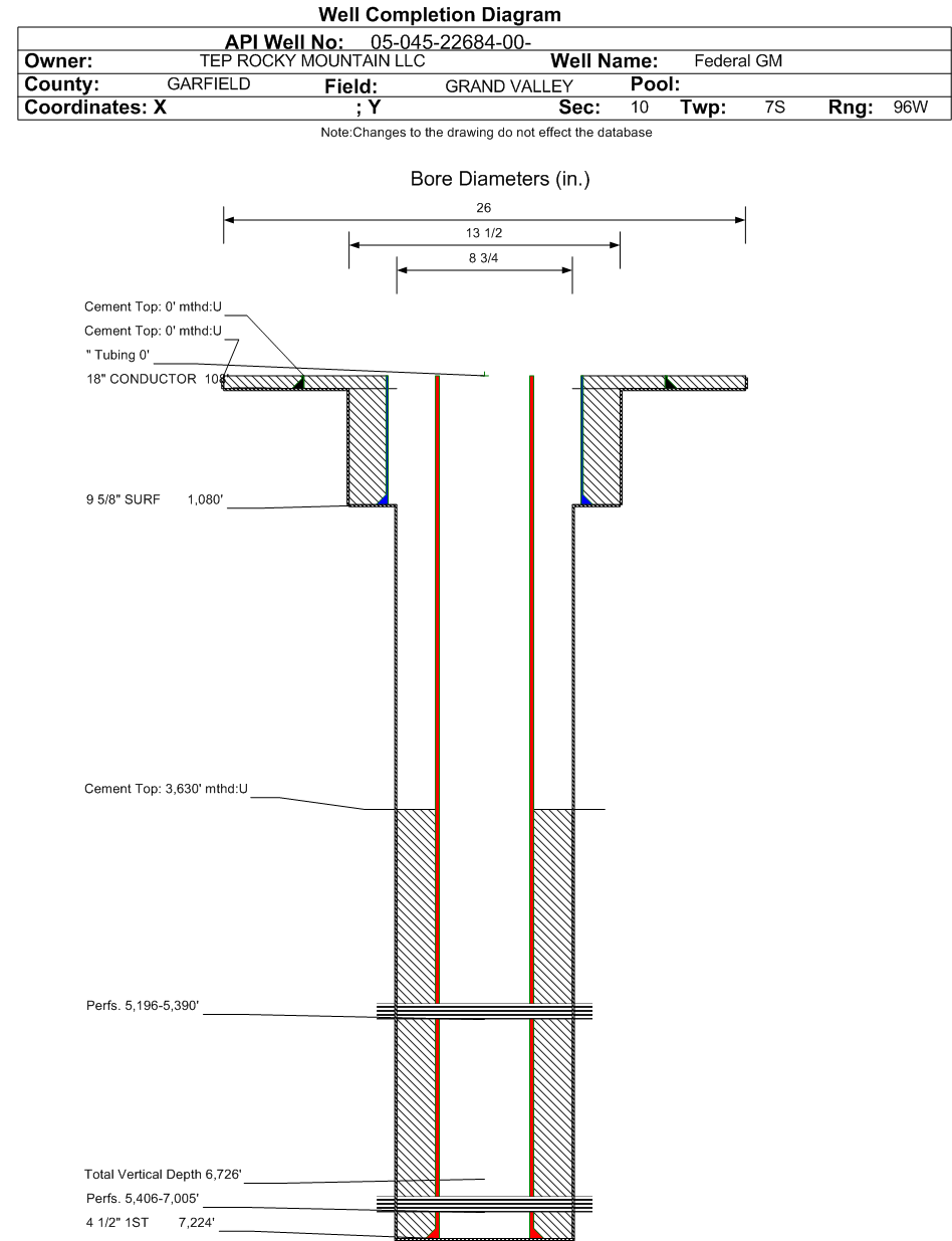 Wellbore #00 Wellbore Classification: GW Status: SI - 6/1/2024 Measured TD: 7224 ft. Vertical TD: 6726 ft.| Wellbore Data for Original Wellbore | Wellbore Classification: GW SI - 6/1/2024 | | Wellbore Permit | DIRECTIONAL | | Permit #: | | Expiration Date: | 12/11/2018 | | Proposed Top PZ Location: | Sec:9 Twp: 7S 96W | Footage: 2302 FNL 181 FEL | | Bottom Hole Location: | Sec:9 Twp: 7S 96W | Footage: 2302 FNL 181 FEL | | Proposed Depth/Form: | 7252 ft. | | Surface Mineral Owner Same: | No | | Mineral Owner: | FEDERAL | Surface Owner: | FEDERAL | | Unit: | | Unit Number: | | | Formation And Spacing: | Code: WMFK , Formation: WILLIAMS FORK , Order: 510-9 , Unit Acreage: , Drill Unit: | | Casing: | String Type: CONDUCTOR, Hole Size: 26 in., Size: 18 in., Top: 0 ft., Depth: 80 ft., Weight: 48 , Citings Type: PLANNED | | Cement: | Sacks: 35, Top: 0 ft., Bottom: 80 ft. | | Casing: | String Type: SURF, Hole Size: 13.5 in., Size: 9.625 in., Top: 0 ft., Depth: 1050 ft., Weight: 32.3 , Citings Type: PLANNED | | Cement: | Sacks: 255, Top: 0 ft., Bottom: 1050 ft. | | Casing: | String Type: 1ST, Hole Size: 8.75 in., Size: 4.5 in., Top: 0 ft., Depth: 7252 ft., Weight: 11.6 , Citings Type: PLANNED | | Cement: | Sacks: 598, Top: 3893 ft., Bottom: 7252 ft. |