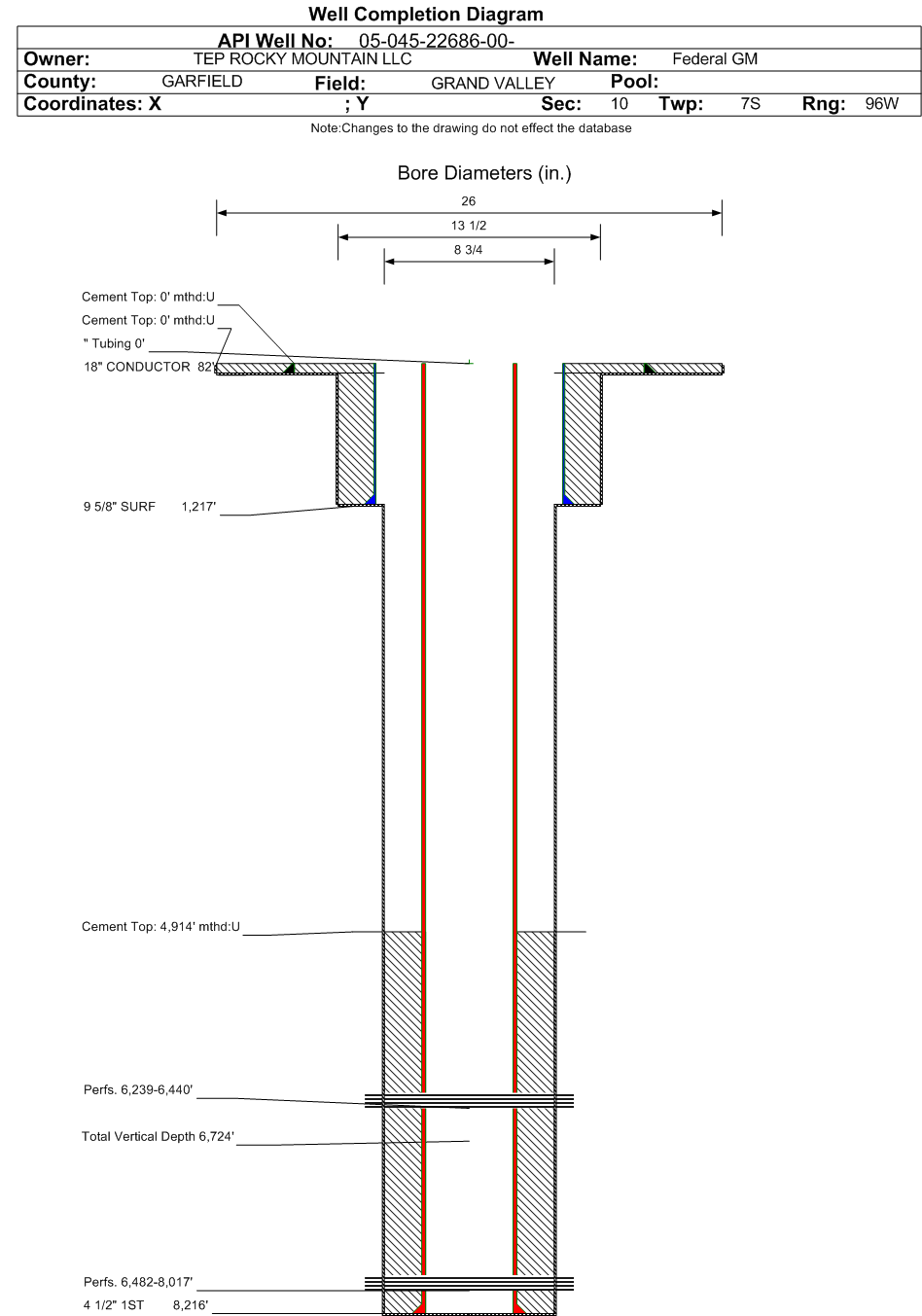 | Wellbore Completed | | Completion Date: | 6/4/2017 | | Spud Date: | 5/30/2017 | Spud Date Is: | ACTUAL | | Measured TD: | 8216 ft. | Measured PB depth: | 8176 ft. | | True Vertical TD: | 6724 ft. | True Vertical PB depth: | 6684 ft. | | Top PZ Location: | Sec:9 Twp: 7S 96W | Footage: 982 FNL 1616 FEL | | Bottom Hole Location: | Sec:9 Twp: 7S 96W | Footage: 990 FNL 1715 FEL | | Log Types: | CBL/PULSED NEUTRON(TRIPLE COMBO IN 045-22704) | | Casing: | String Type: CONDUCTOR, Hole Size: 26 in., Size: 18 in., Top: 0 ft., Depth: 82 ft., Weight: 47.44 , Citings Type: ACTUAL | | Cement: | Sacks: 137, Top: 0 ft., Bottom: 82 ft., Determination Method: VISU | | Casing: | String Type: SURF, Hole Size: 13.5 in., Size: 9.625 in., Top: 0 ft., Depth: 1217 ft., Weight: 32.3 , Citings Type: ACTUAL | | Cement: | Sacks: 330, Top: 0 ft., Bottom: 1217 ft., Determination Method: VISU | | Casing: | String Type: 1ST, Hole Size: 8.75 in., Size: 4.5 in., Top: 0 ft., Depth: 8216 ft., Weight: 11.6 , Citings Type: ACTUAL | | Cement: | Sacks: 765, Top: 4914 ft., Bottom: 8216 ft., Determination Method: CBL | | Formation | Interval Top | Log Bottom | Cored | DSTs | | WASATCH G | 2983 ft. | | | | | MESAVERDE | 5067 ft. | | | | | OHIO CREEK | 5067 ft. | | | | | WILLIAMS FORK | 5169 ft. | | | | | CAMEO | 7724 ft. | | | | | ROLLINS | 8087 ft. | | | |